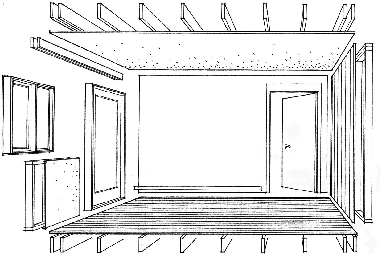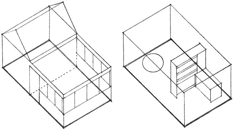 Interior spaces are formed first by a building’s structural system, further defined by wall and ceiling planes, and related to other spaces by windows and doorways. Every building has a recognizable pattern of these elements and systems. Each pattern has an inherent geometry that molds or carves out a volume of space into its likeness.