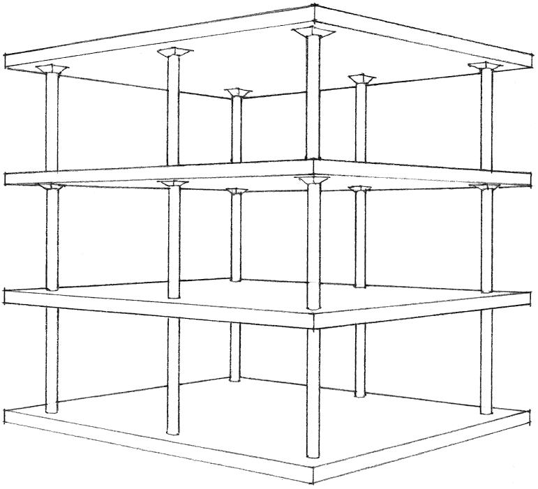 When integrally connected with reinforced concrete columns, flat slabs can be supported without beams. They form horizontal layers of space punctuated only by the shafts of the supporting columns.