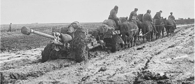 A mounted gun crew moving to a new position. Mud affected both sides: in autumn 1941 it delayed the German offensive at a crucial moment and allowed the Soviets to build up the Moscow defenses In 1942, as the snows melted to mud, so the Soviet counteroffensive faltered RIA Novosti archive, image #90027/ Lander/WikiCommons (CC-BY-SA 3 0)