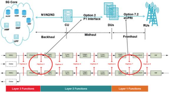 The fronthaul is the connection between the baseband unit (BBU) and remote radio head (RRH). It becomes much more challenging with 5G. A lot more data needs to go back and forth because of higher bandwidths and more antenna ports using massive multiple-input/multiple-output (massive MIMO) technology, leading to the use of the following solutions in O-RAN: