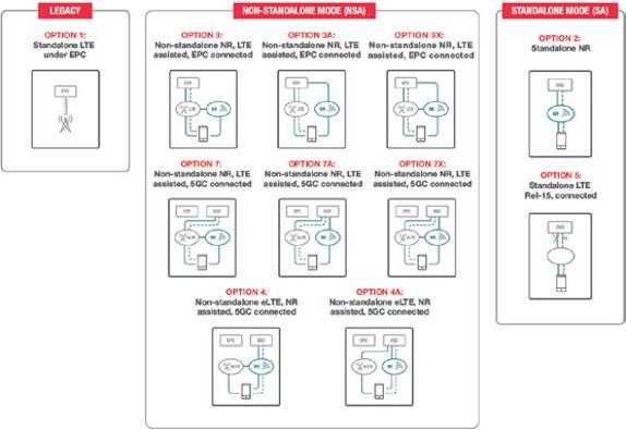 5G can operate in NSA mode — using the existing 4G LTE radio and evolved packet core (EPC) network and eNodeB (eNB) as an anchor and control plane — or in SA mode — using 5G NR and connecting directly to the 5G next-generation core (NGC), operating independently of 4G (see Figure 1-4).