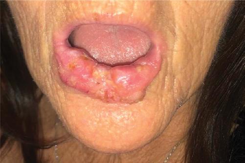 The lesion is exquisitely painful, particularly along the right lower lip. She has not experienced any voice changes or weight loss and has not noticed any neck masses.