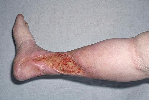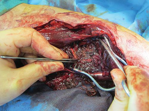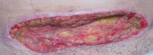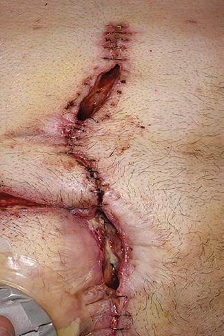 Postoperative wound dehiscence caused by surgical site infection. The resulting wound is now clean and suitable for treatment with negativepressure wound therapy (see Chapter 13).