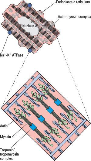 Imaginethattheheartismadeupofaseriesofsmallbarrelsorcells(Figure2-1)Eachofthesebarrelsismadeupoftwohalvesthatslideover eachotherandareheldtogetherbyinterlockingpieces(actinandmyosinproteins)Theactinmoleculesareattachedtotheoutsideedgesofthe barrelwall,andthemyosinmoleculesareinterspersedbetweentheactinmolecules
