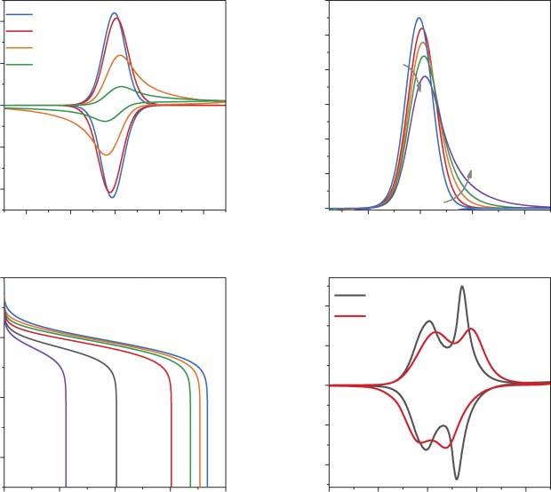 Figure2.3 (a)SimulatedCVs(E eq = 4.0V, g1 = 1, m = 0.5mg, �� = 0.1mVs 1 , D = 10 9 cm2 s 1 , �� = 0.5, d = 1 μm)fordifferentvaluesof k s .(b)Theeffectofthescanrate (0.05,0.1,0.3,0.7,1.5mVs 1 )ontheCVshape(currentisnormalizedtothescanrate). (c)TheeffectofthetransfercoefficientvalueontheCVpeakssymmetry(D = 10 9 cm2 s 1 , k s = 10 9 cms 1 ).(d)Charge/dischargecurvesforthecaseofratecontrolbyslowcharge transfer(D = 10 9 cm2 s 1 , k s = 10 9 cms 1 )calculatedfordifferent C rates: C /10,1C ,2C , 5C ,10C