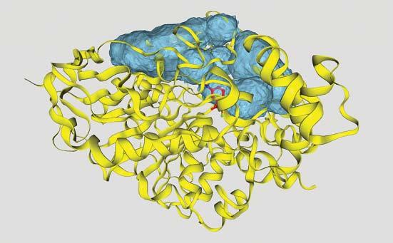 Figure1.7 Trimethylammoniotrifluoroacetophenoneligandboundintheactivesiteof acetylcholinesterasefrom tetronarcecalifornica (PDBcode1AMN).Thesurfacecontours illustrateseveralporesandcavitiesthatmakeuptunnelsleadingtotheinternalactivesite. Source:ThefigurewasgeneratedwiththeProPores2webserver(https://service .bioinformatik.uni-saarland.de/propores)[8].