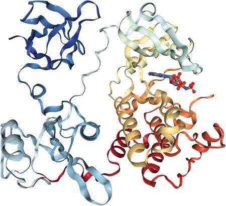 Figure1.1 X-raystructure (PDBcode1AD5)ofhuman Srckinase.Thepeptide sequencestartswithanSH3 domain(topleft),followed byanSH2domain(bottom left)andthenleadstothe catalytickinasedomain (right).ATPisbound betweensmall(top)and largelobe(bottom)ofthe kinasedomain.Source: FiguregeneratedwithNGL viewer.