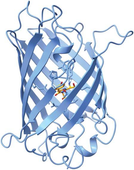 Figure1.3 X-raystructure ofthegreenfluorescent proteinfrom Aequorea victoria (PDBcode1EMA). Thebarrel-shapedstructure isformedby11beta-strands surroundingacentral alpha-helixholdingthe chromophore.Source: FiguregeneratedwithUCSF Chimera.