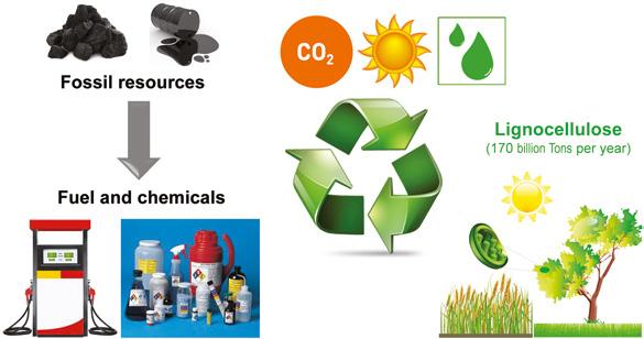 These chemical feedstocks are obtained primarily from fossil resources (coal and oil) formed by the photosynthesis of ancient plants. Ancient plants used solar energy to convert CO2 into biomass, then the residue of animals and plants in food webs were transformed to fossil resources after millions of years underground.