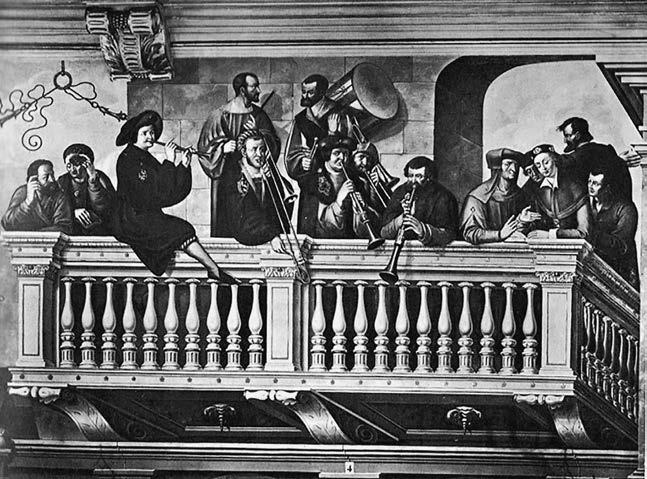 c. 1520—Nuremberg, Germany: A mural attributed to various artists, including Hans Holbein and Albrecht Dürer, depicting members of the town wind band playing from a balcony