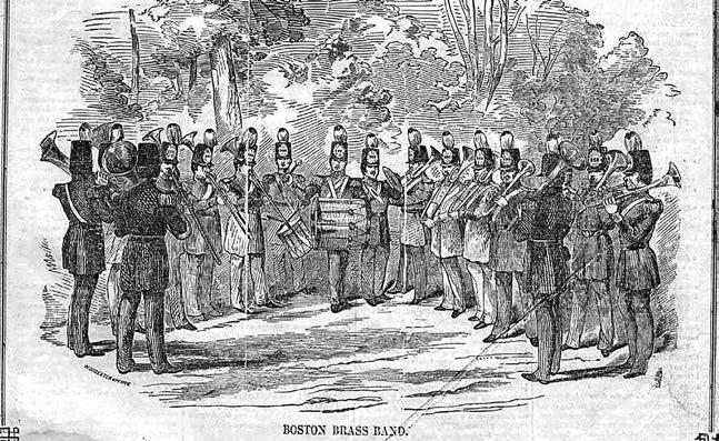 1851—Boston, MA: A woodcut from Gleason’s Pictorial Magazine (August 9, 1851) depicting the Boston Brass Band, which utilized exclusively over-the-shoulder brass instruments