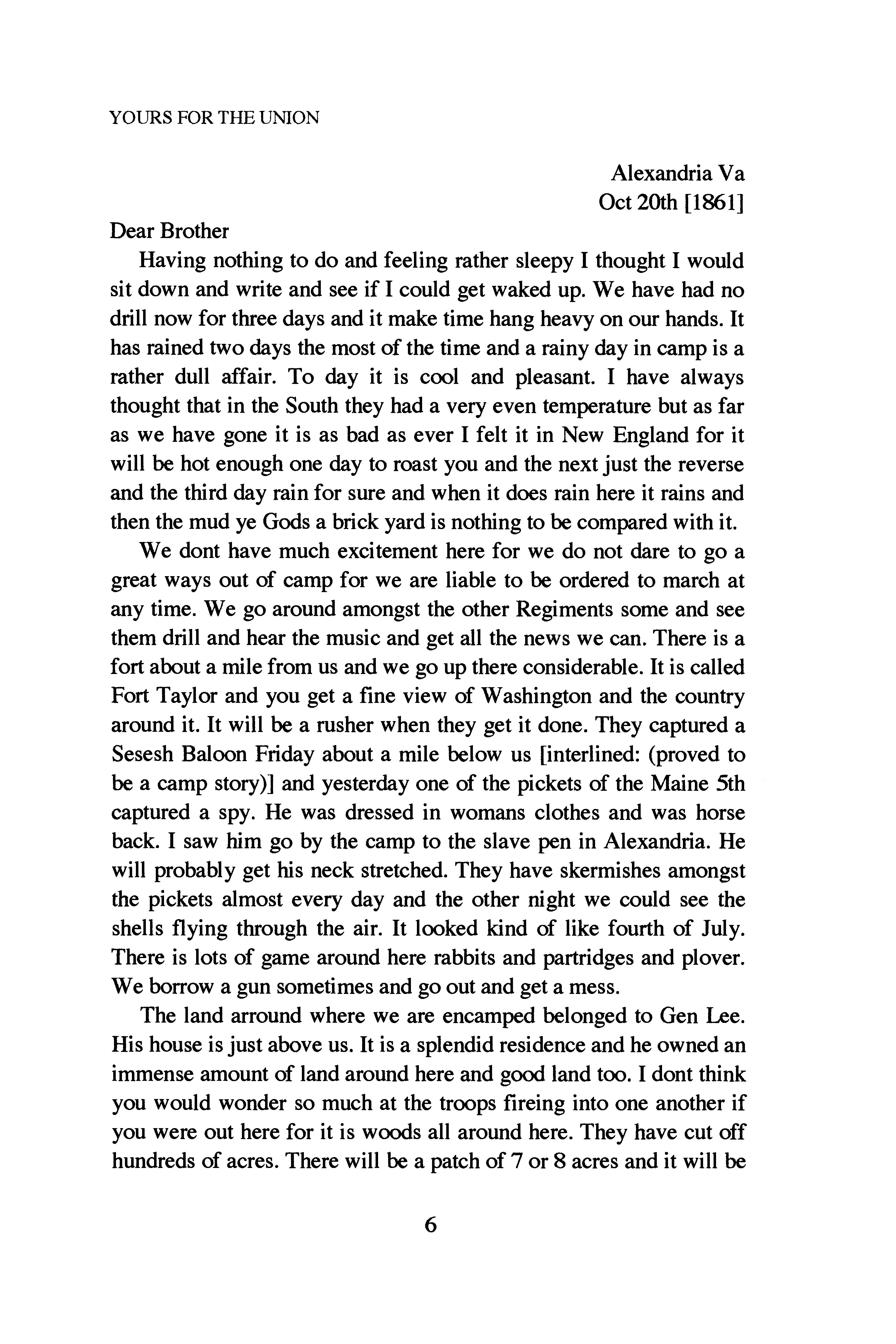 I had got this far and was ordered out for a knapsack drill the first we have had since we have been out here. We have not been worked very hard since we have been here but when we do get a drill we get a rough one. I begin to think some times that we are not going to get a lick at the rebels. One thing I am sure of if we do not advance in the course of four weeks we shall not make one this winter for they tell me here that then the rainy season sets in and they say that we have not seen any rain yet but I dont know what it can be for the roads are now almost as bad as they are there in the spring and if it is as bad as they say it is no 6 horses can draw any peice or casson over these roads but if they do have a fight I hope we shall be reckoned in for I want to see what we are made of and try them Parrotts and see if they will do what they say they will but I think that the policy is to starve the devils out. I went yesterday to visit a Fort just out of Alexandria. They have got 6, 64 pounders mounted besides a park of light Artillery. It is a gay place. You can see miles all around. We have a fort above us and one below us. I dont [think] they intend to retreat into Washington again.