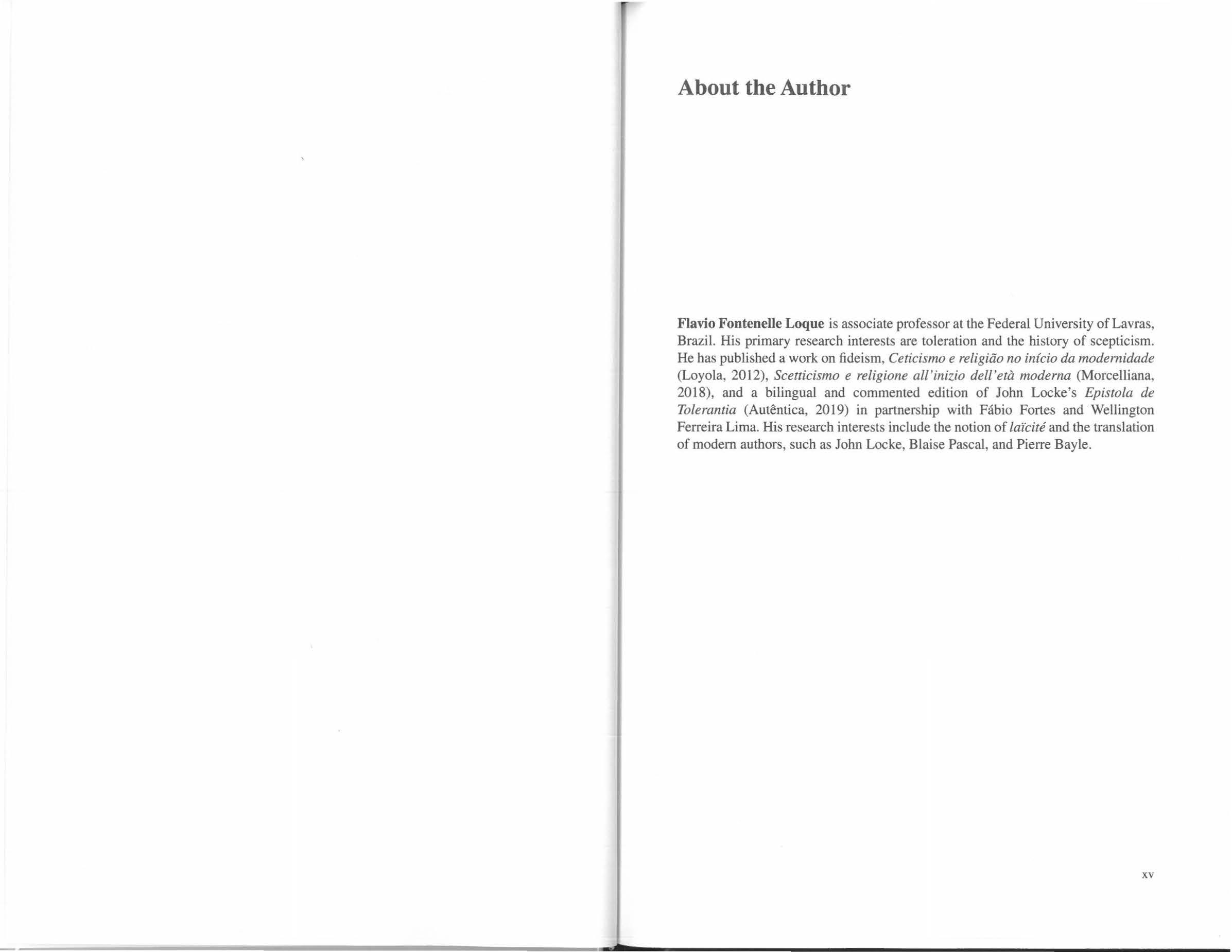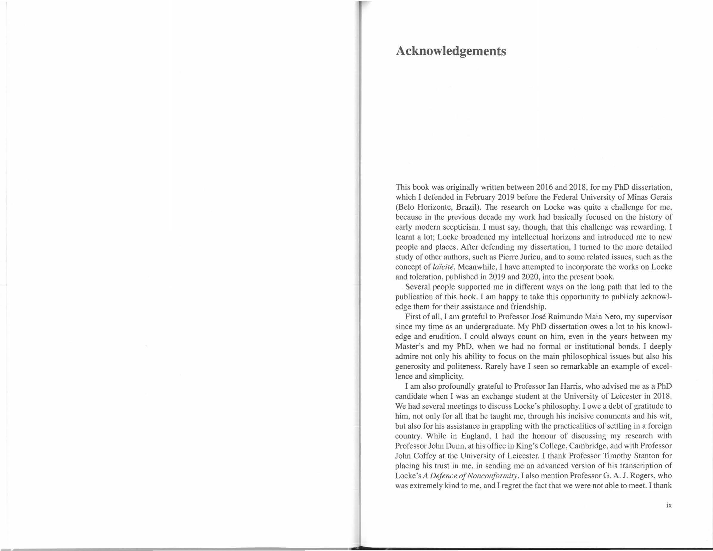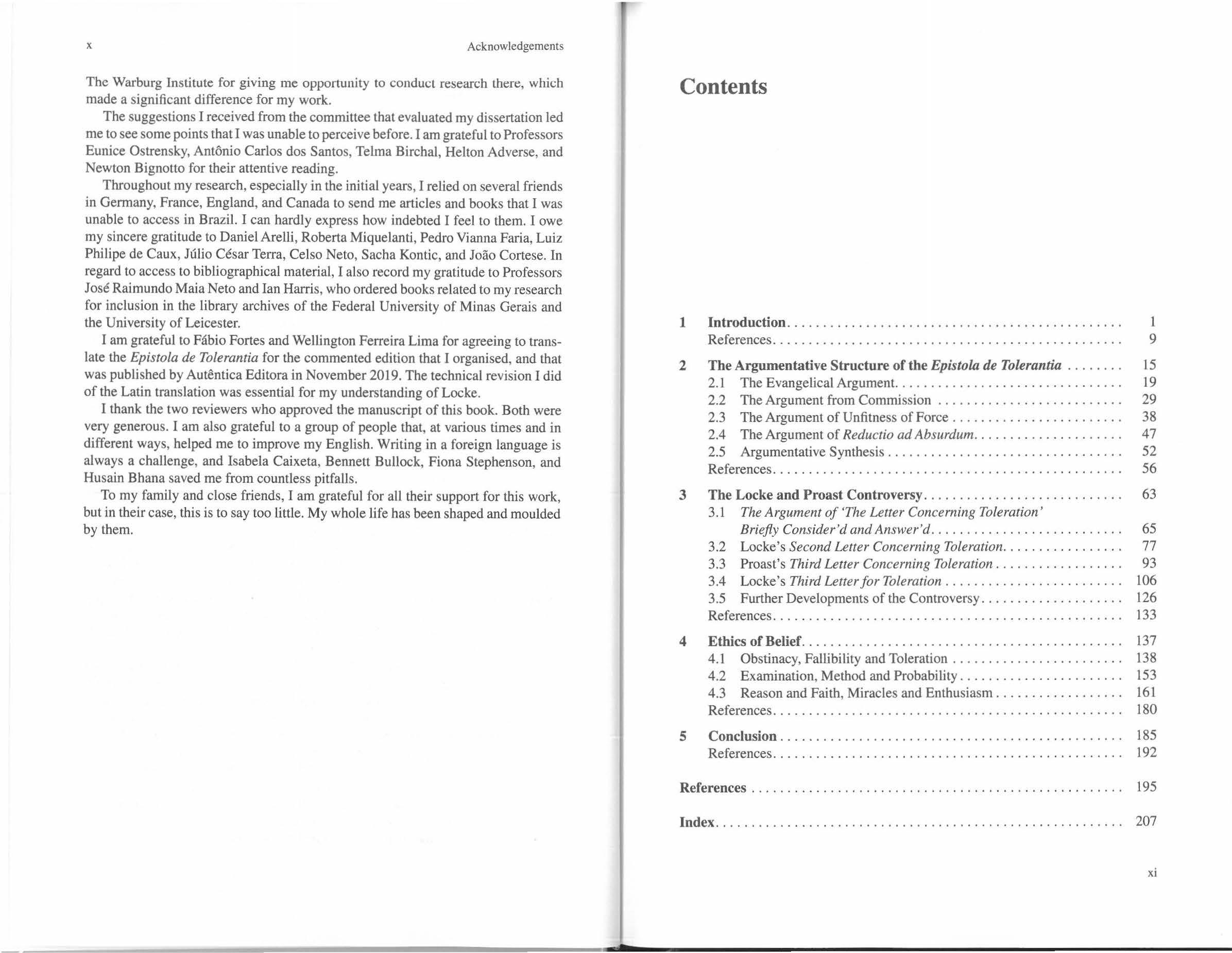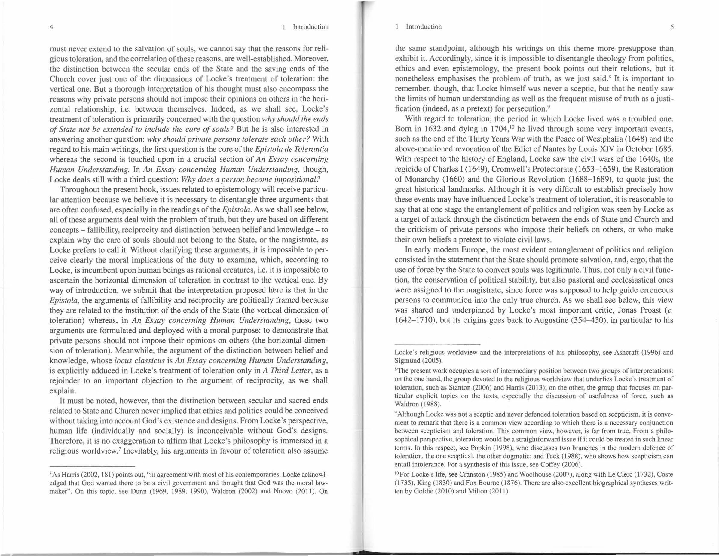 At the end of this book, we hope to convey a coherent and comprehensive view of Locke's mature treatment of toleration, in which we see clearly the two dimensions of to leration and their grounding reasons. We also hope that this book will provide elements for reflecting on our contemporary world, in which religious fanaticism has prompted urgent discussion on the ends of State and Church, and reflection about the duties of private persons one to another.