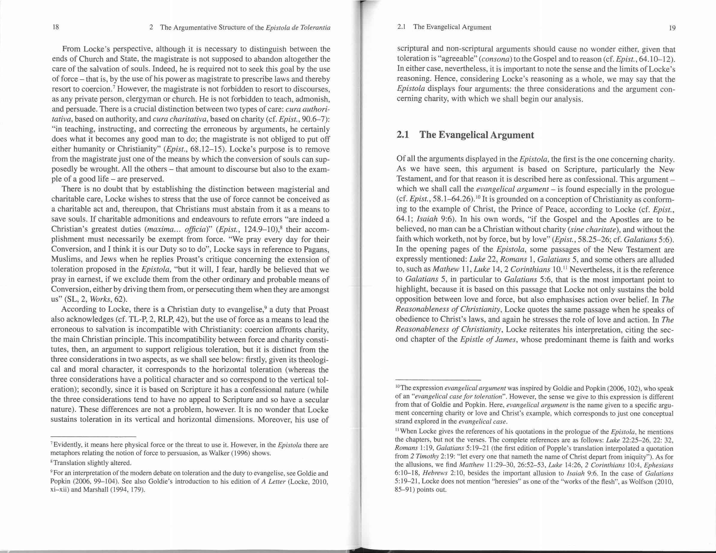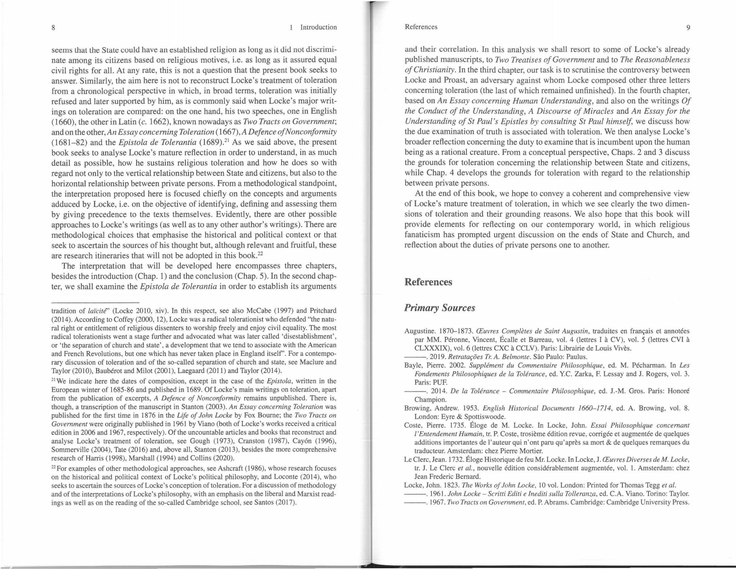 seems that the Stale could have an established religion as long as it did not discriminate among its citizens based on religious motives, i.e. as long as it assured equal civil rights for all. At any rate, this is not a question that the present book seeks to answer. Similarly, the aim here is not to reconstruct Locke's treatment of toleration from a chronological perspective in which, in broad terms, toleration was initially refused and later supported by him, as is commonly said when Locke's major writings on toleration are compared: on the one hand, his two speeches, one in English (1660), the other in Latin (c. 1662), known nowadays as Two Tracts on Government; and on the other, An Essay concerning Toleration ( 1667),A Defence ofNonconformity (1681-82) and the Epistola de Tolerantia (1689). 21 As we said above, the present book seeks to analyse Locke's mature reflection in order to understand, in as much detail as possible, how he sustains religious toleration and how he does so with regard not only to the vertical relationship between State and citizens, but also to the horizontal relationship between private persons. From a methodological standpoint, the interpretation proposed here is focused chiefly on the concepts and arguments adduced by Locke, i.e. on the objective of identifying, defining and assessing them by giving precedence to the texts themselves. Evidently, there are other possible approaches to Locke's writings (as well as to any other author's writings). There are methodological choices that emphasise the historical and political context or that seek to ascertain the sources of his tho ught but, although relevant and fruitful, these are research itineraries that will not be adopted in this book. 22