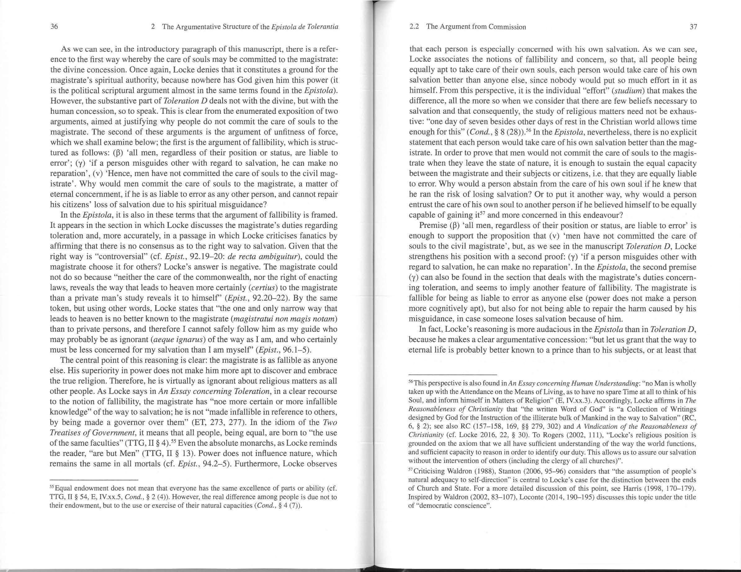 40 In fact, this argument is an enthymeme. In order to be valid, the reasoning requires another premise: the commission to take care of so uls may be committed to the magistrate either by God or by men. It seems that Locke has always worked with this disjunction. It is found in the First Tract on Government (cf. Locke 1967, 126) and reappears in An Essay concerning Toleration (ET, 270).