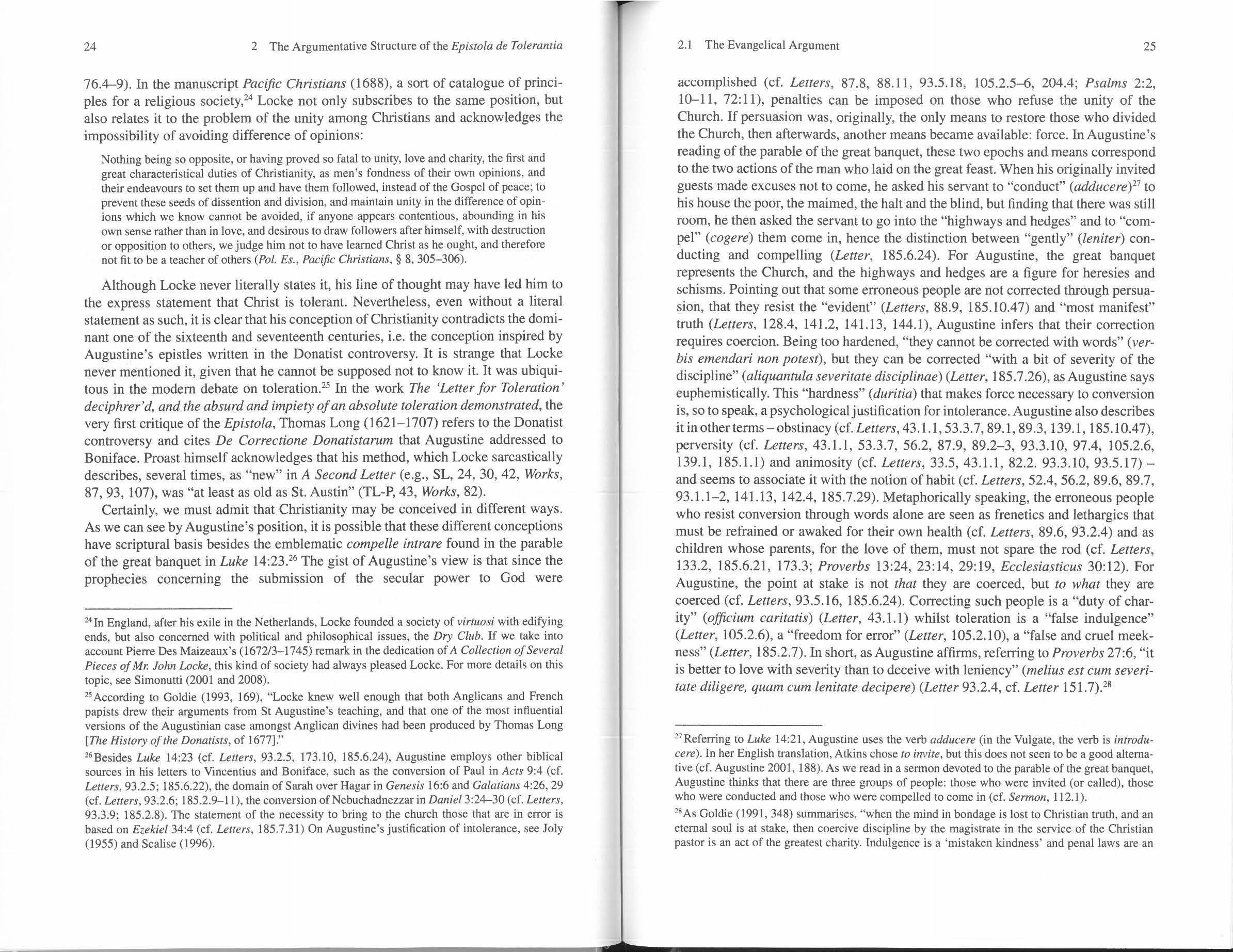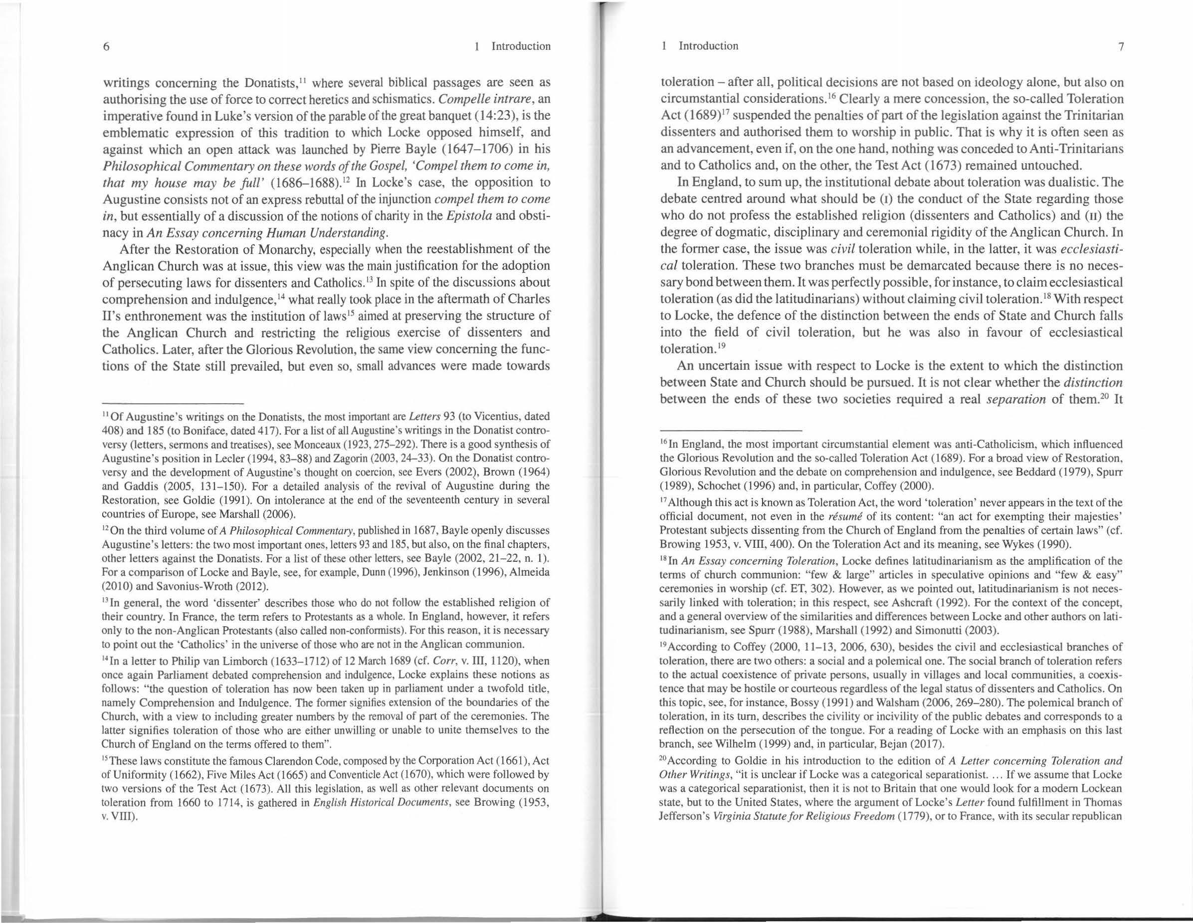 11 Of Augustine 's writings on the Donatists, the most important are Letters 93 (to Vicentius, dated 408) and 185 (to Boniface, dated 417). For a list of all Augustine 's writings in the Donatist controversy ( letters , sermo ns and treatises). see Monceaux (1923, 275-292) There is a good syn the sis of Augustine's pos ition in Lecler (1994, 83-88) and Zagorin (2003, 24-33) On the Donatist controversy and the development of Augustine 's thought on coercion , see Evers Brown (1964) and Gaddis (2005, 131 - 150) For a detailed analysis of the revival of Augustine during the Restoration , see Goldie (199 1). On intolerance at the end of the seventeenth century in several countries of Europe, see Marshall (2006).