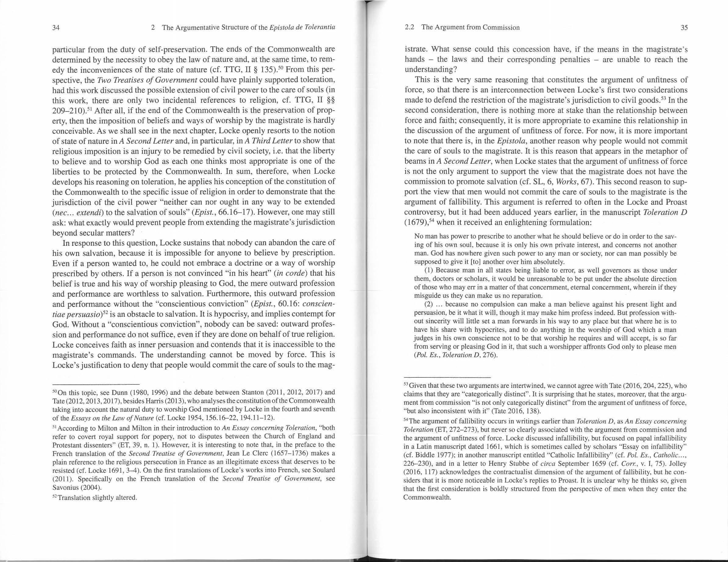 Thi s is the very same reasoning that constitutes the argument of unfitness of force, so that there is an interconnection between Locke 's first two considerations made to defend the restriction of the magistrate's jurisdiction to civil goods. 53 In the second consideration, there is nothing more at stake than the relationship between force and faith; consequently, it is more appropriate to examine this relationship in the discussion of the argument of unfitness of force. For now, it is more important to note that there is, in the Epistola, another reason why people would not commit the care of souls to the magistrate. It is this rea son that appears in the metaphor of beams in A Second Letter, when Locke states that the argument of unfitness of force is not the only argument to support the view that the magistrate does not have the commission to promote salvation (cf. SL, 6, Works, 67). This second reason to support the view that men would not commit the care of souls to the magistrate is the argument of fallibility. This argument is referred to often in the Locke and Proast controversy, but it had been adduced years earlier, in the manuscript Toleration D (1679), 54 when it received an enlightening formulation :