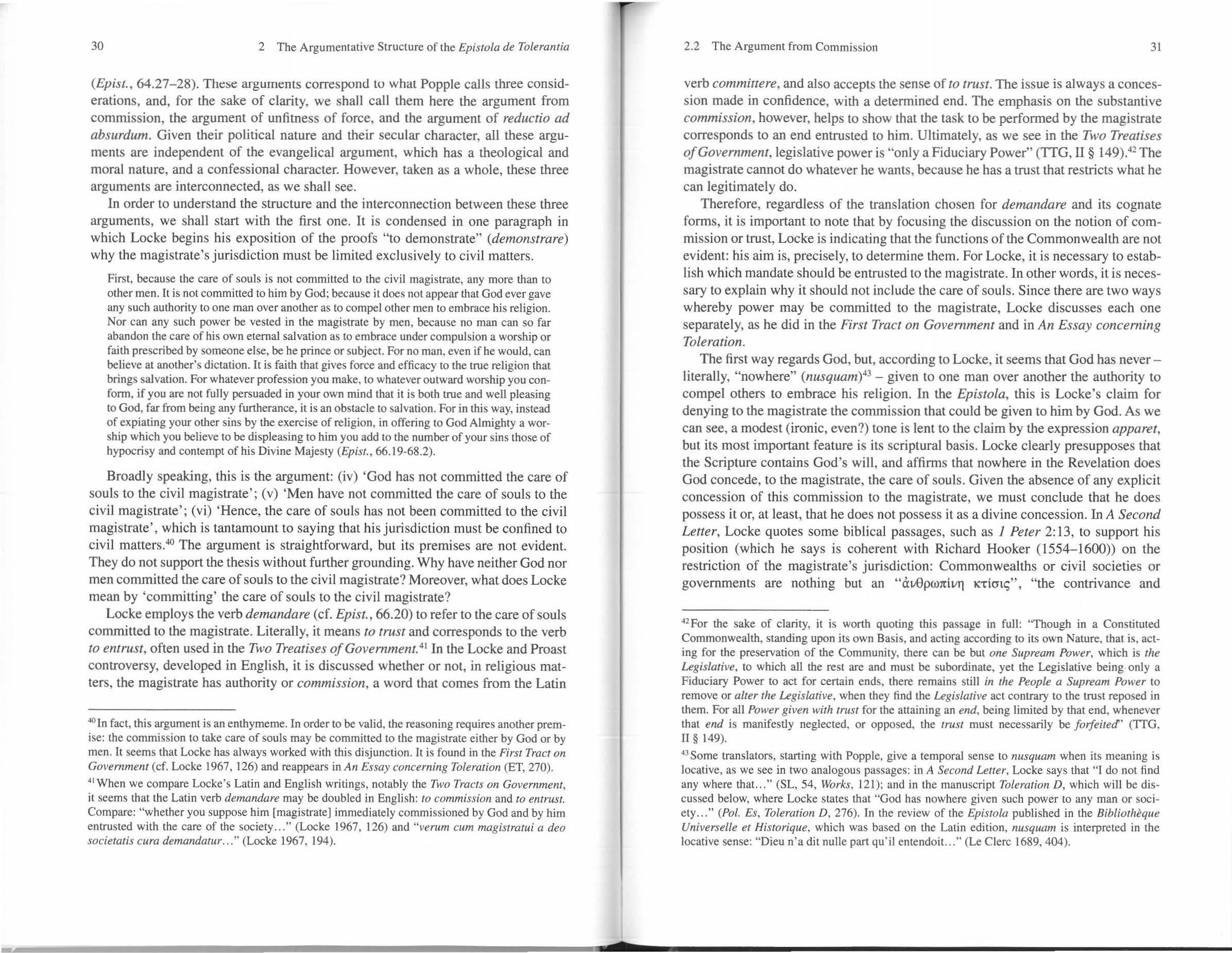 Locke employs the verb demandare (cf. Epist., 66 .20) to refer to the care of sou ls committed to the magistrate. Literally, it means to trust and corresponds to the verb to entrust, often used in the Two Treatise s of Government. 41 In the Locke and Proast controversy, developed in English, it is discussed whether or not, in religious matters, the magis trate has authority or commission , a word that comes from the Latin
