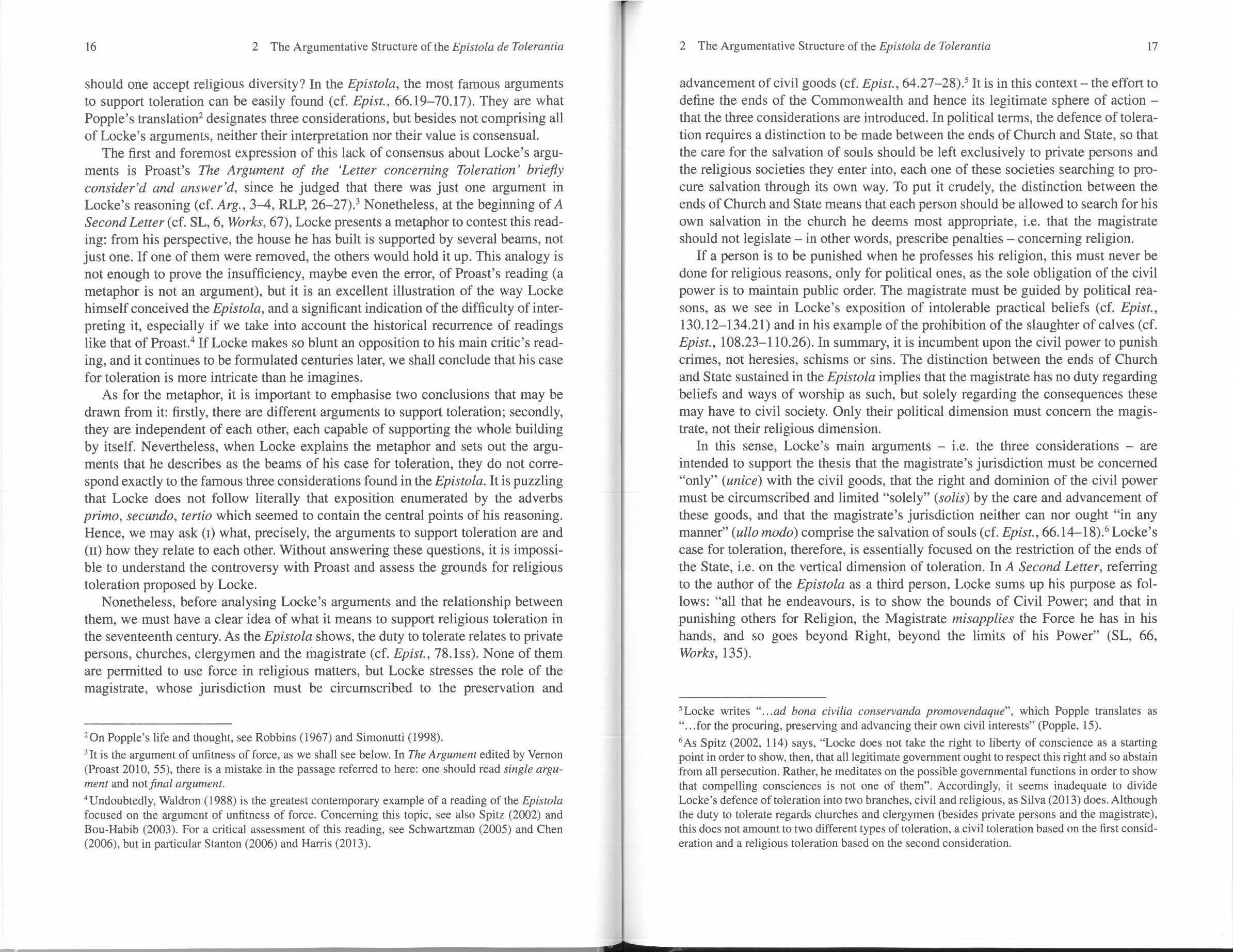 8 The pre sent work occupies a sort of intennediary position between two groups of interpretations: on the one hand , the group devoted to the religious worldview that underlies Locke's treatment of to leration , s uc h as Stanton (2006) and Harris (20 13); on the other, the group that focuses on particular explicit topics on the texts, especial ly th e discussion of u seful ness of force , such a s Waldron ( 1988).