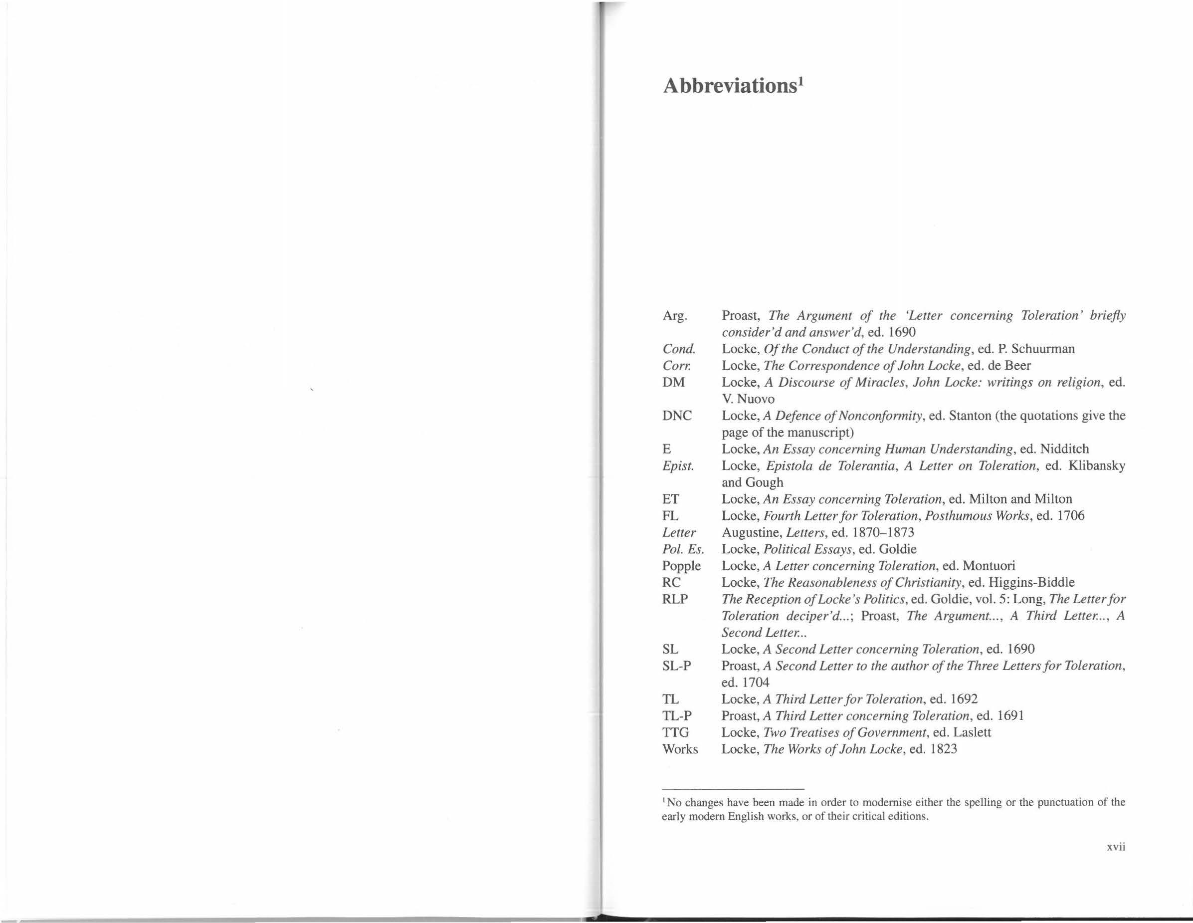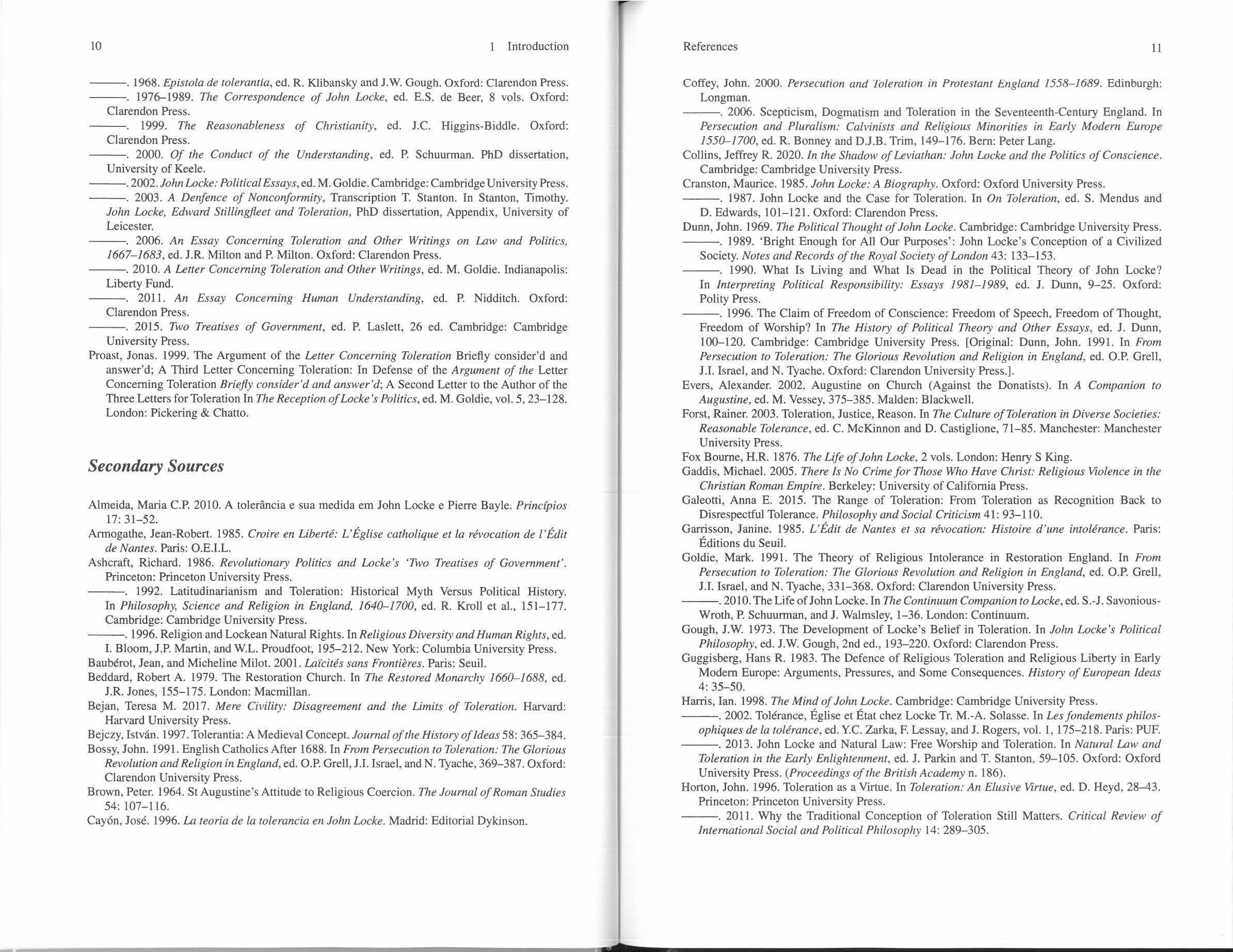 21We indicate here the dates of composition, except in the case of the Epistola, written in the European winter of 1685-86 and published in 1689. OfLocke's main writings on toleration, apart from the publication of excerpts, A Defence of Nonconformity remains unpublished. There is, though, a transcription of the manuscript in Stanton (2003). An Essay concerni11g Toleration was published for the first time in 1876 in the Life of Joh11 Locke by Fox Bourne; the Two Tracts 011 Government were originally published in 1961 by Viano (both of Locke's works received a critical edition in 2006 and 1967, respectively). Of the uncountable articles and books that reconstruct and analyse Locke's treatment of toleration, see Gough (1973), Cranston (1987), Cay6n (1996), Sommerville (2004), Tate (2016) and, above all, Stanton (2013), besides the more comprehensive research of Harris ( 1998), Marshall (1994) and Collins (2020).