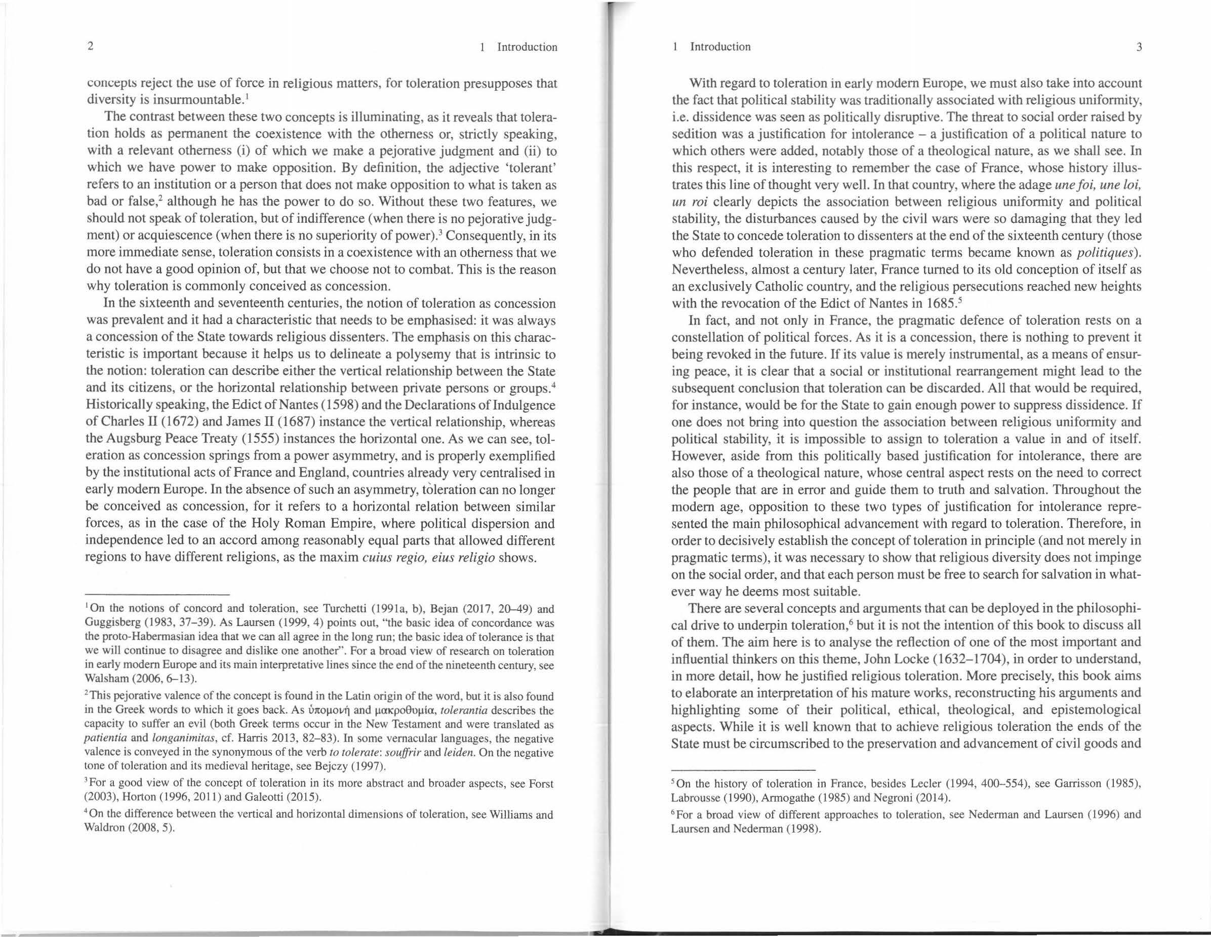 1 0n the notions of concord and toleration , see Turchetti (199la, b), Bejan (2017 , 20-49) and Guggi sberg ( 1983 , 37-39). As Laursen (1999, 4) points out, " the bas ic idea of concordance was the proto-Haberrnasian idea that we can all agree in the long run ; the bas ic idea of tolerance is that we will c o ntinue to di sagree and dislike one another". For a broad view of re search on toleration in early modem Europe and it s main interpretati ve lines sin c e the end of the nineteenth century, see Wal sham (2006, 6-13 ).