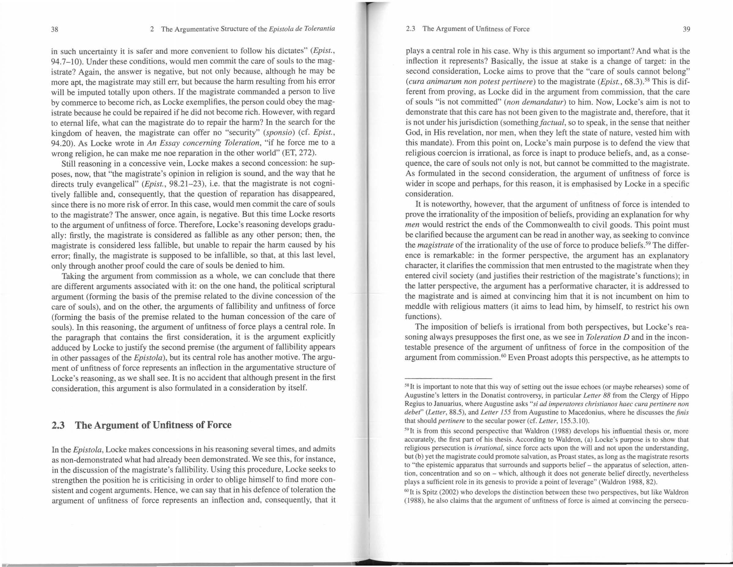 Taking the argument from commission a s a whole, we can conclude that there are different arguments associated with it: on the one hand, the political scriptural argument (forming the basis of the premise related to the divine concession of the care of souls), and on the other, the arguments of fallibility and unfitness of force (forming the bas is of the premise related to the human conces sio n of the care of so ul s) . In thi s reaso ning , the argument of unfitness of force plays a central role. In the paragraph that contains the first consideration , it is the argument explicitly adduced by Locke to justify the second premise (the argument of fallibility appears in other pas sages of the Epistola), but its central role has another motive. The argument of unfitness of force represents an inflec tion in the argumentative s tructure of Locke's reasoning , as we shall see. It is no accident that although prese nt in the first consideration, thi s argument is also formulated in a consideration by itself.