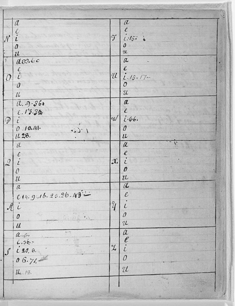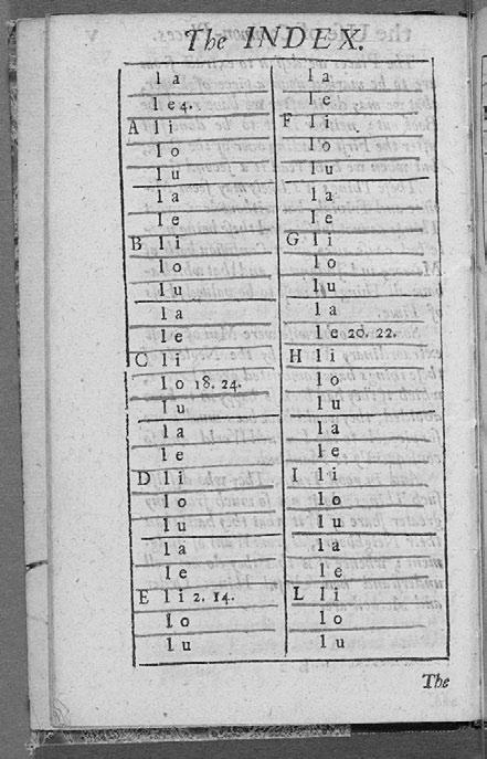 As a young man like Samuel knew all too well, it could be downright tedious to keep track of what one read—not to mention what one thought about it. Honed over decades of trial and error, Locke’s method for commonplacing, posthumously published as A New Method of Making CommonPlaceBooks (1706), streamlined, simplified, and regimented this process.46 Specifically, Locke’s method entailed indexing entries on a grid, in cells, based on an assessment of a reading’s most appropriate title or subject head, using both the first letter and first vowel of the subject. Locke recommended