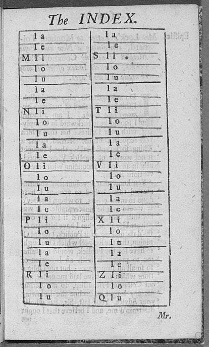 using capital letters for the heads or titles and Latin for these as well as for the index. One could, for example, record notes from a reading under the title “EPISTOLA,” writing it in large letters in the margin of a page for notes and then index this entry by writing the page number for these notes under the first letter “E” and the first vowel “I” in the index. Locke’s approach meant that someone like Samuel could create the index as he went, rather than waiting until the notebook was full. But because the titles were not written out fully in the index, the user had to accurately remember that he had, for example, selected “EPISTOLA” as the appropriate categorization. In contrast to more free-form approaches, Locke’s demanded precision.