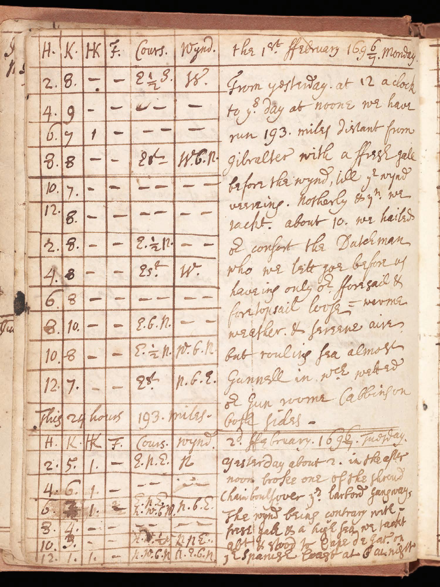 As soon as they departed Cadiz, however, on 1 February, Looker recommenced his intermittent habit, when the ship is at sea, of entering in tabular form the details of her daily passage, on the left-hand side of the page, recording some or all of the details of her speed, course and the prevailing wind every two hours, and adding at the foot of the table the estimated distance run in the previous 24 hours.3 In his daily journal entry, written on the right-hand half of the page, Looker paraphrases and adds further details to the data from the log, e.g. (for 1 February): ‘From yesterday at 12 a clock to this day at noone we have run 193 miles distant from Gibralter with a fresh gale before the wynd, till the wynd veereing Northerly and then we tackt’.4 One consequence of this stop-start approach to Looker’s more detailed, personal style, is that sections of the text offer almost nothing to the reader beyond the data we would expect from a ship’s log. For instance, Looker’s account of the two and a half weeks’ return voyage from Smyrna to Messina in the first weeks of 1698 is a bleak one, a detailed record of wind and weather, landfalls and storms, but one entirely devoid of reference to any living persons. In the ten pages of the