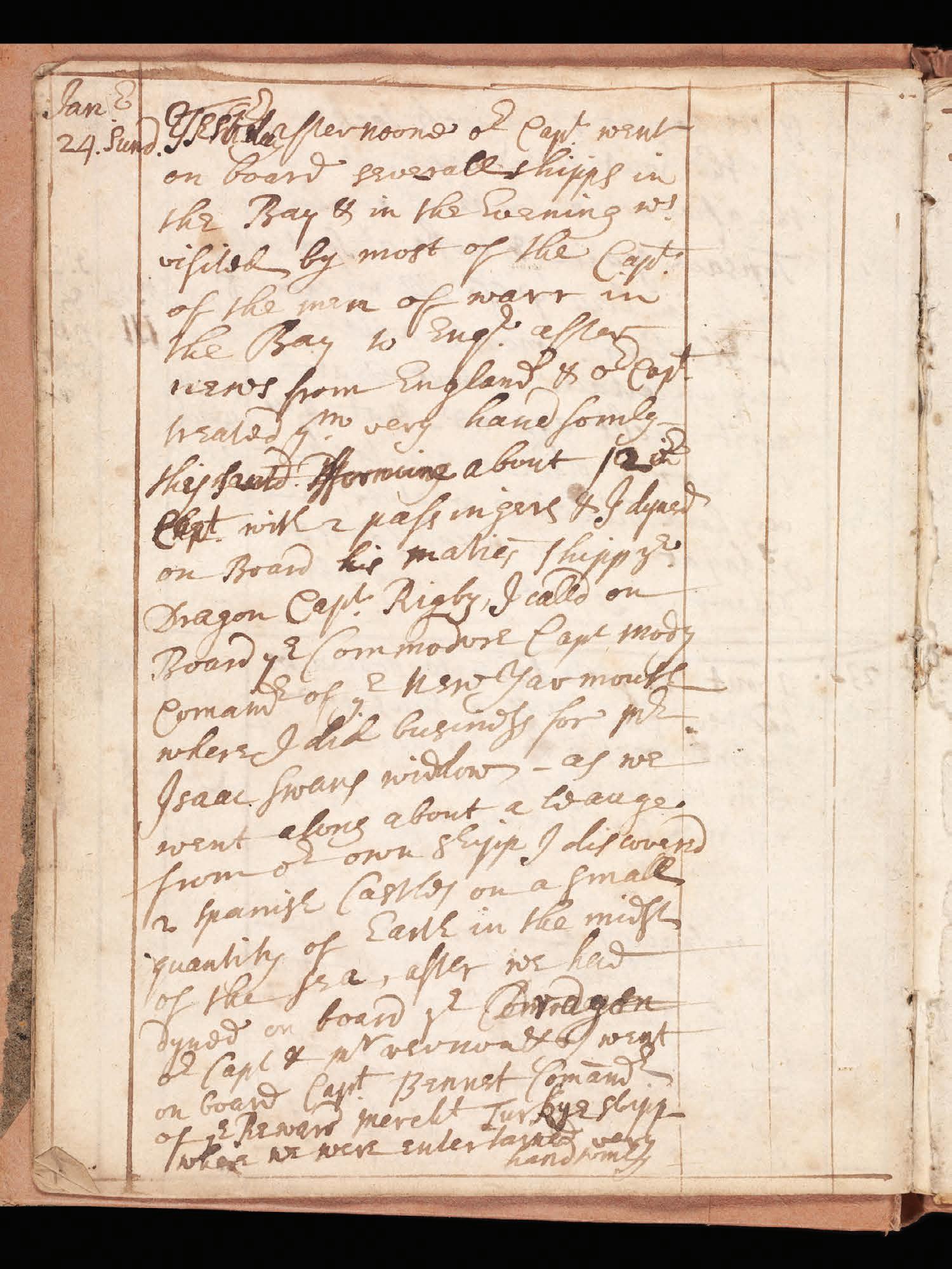 To demonstrate this point, it is worth taking the time to examine the mutability of Looker’s stylistic approach at different points during they voyage. For example, the Blackham Galley’s arrival at Cadiz brought a sudden shift from a solitary life at sea to a social life in port and Looker’s narrative style shifts in recognition of his changing experience. Writing up his ‘Journall’ on 24 January 1696/7, a Sunday, he notes that ‘Yesterday, after noone’ – i.e. immediately after the ship anchored off the Diamond –‘our Captain went on Board severall shipps in the Bay and in the Evening was visited by most of the Captains of the men of warr in the Bay to enquire after news from England’. Looker now, for the first time since leaving England, brings himself into the narrative, recording that ‘about 12 [noon on Sunday]’ Captain Newnam, two unnamed passengers and he himself dined on board HMS Dragon (Captain Rigby). Looker adds that he had also called on board the New Yarmouth (Captain Moody), ‘where I did business [unspecified] for Mr Isaac Swans widow’. After dining on board the Dragon, Newnam, Looker and a Mr Vernon, one of the passengers, went on board the ‘Turkye shippe’ Reward Merchant (Captain Bennet), ‘where we were entertained handsomly’ until about ten at night, when the party, returning on board the Blackham Galley’s eight-oar pinnace, was unable to make headway against a strong tide and were forced to take shelter on the Canterbury Merchant, about two miles distant from their own vessel, where with some difficulty they got on board, ‘I hanging by the side rope between wynd and water till the men brought the boat to’.