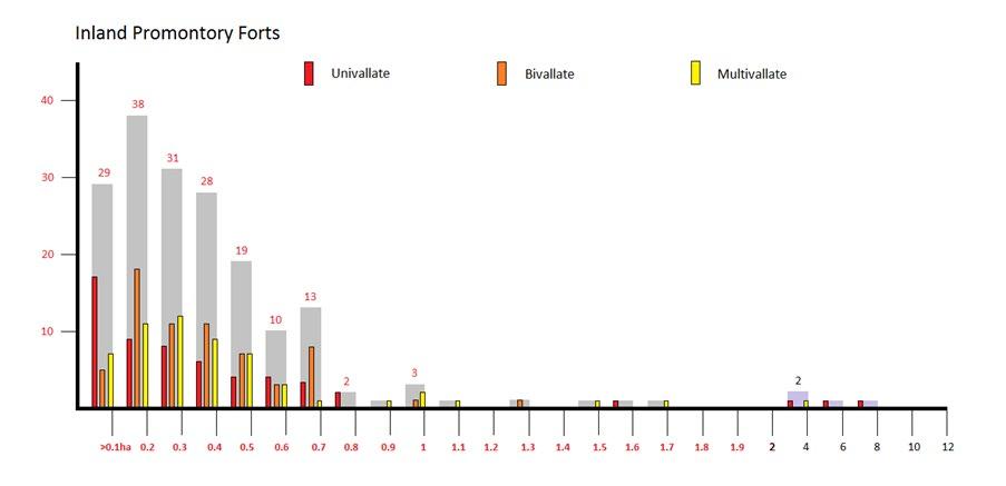 The pattern of vallation is displayed against size on the graph (Fig. 5), which also shows the ghost of the coastal promontory fort sizes. What may be skewing the percentages is revealed in the pattern of sizes, since