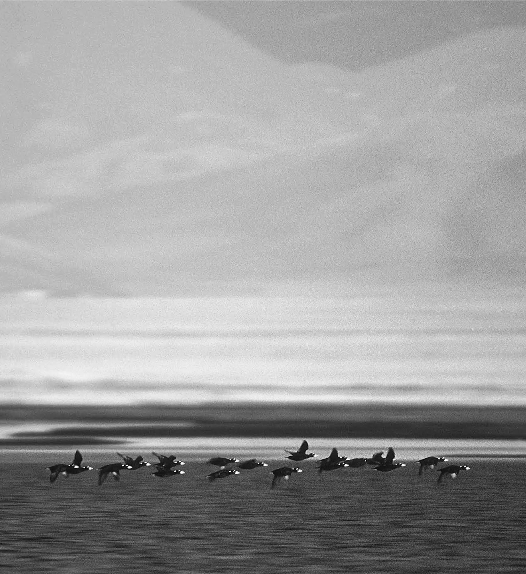 Surf scoters over Beaufort Lagoon, with coastal plain and Brooks Range in the background, Arctic National Wildlife Refuge. Photograph by Subhankar Banerjee, July 2002.