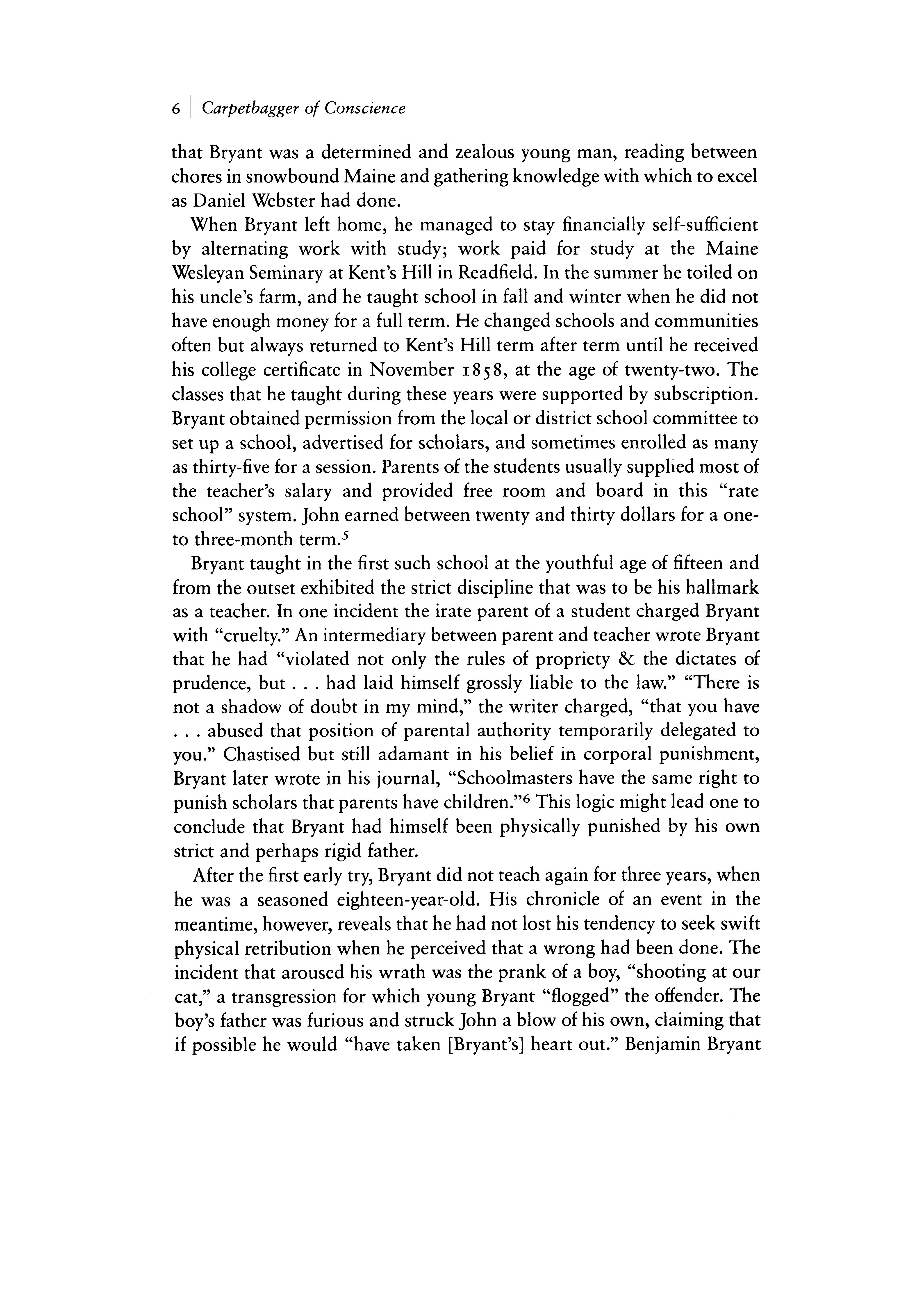 It would be unjust to note only the trouble spots of Bryant's teaching career. He conducted numerous schools between I 8 54 and I 8 6o without recording any incident of difficulty or discord. There were, however, enough serious conflicts to create an observable pattern. One episode in North Wayne, Maine, led the community to coin the phrase "a Bryant scrape" and made it clear that the earlier incidents were not aberrations but symptoms of a developing character. In North Wayne, Bryant's belief in strict discipline was dramatized in his handling of a problem child who happened to be the son of Mr. Taylor, the school superintendent. Because the boy had been "sassy" to him after repeated warnings, Bryant "cuffed" him with a book while holding him by the hair. The boy then grabbed Bryant, and the schoolmaster, by his own admission, struck the pupil "with my right fist and made his left eye as black as my boot before he would let go. When he let me alone I stopped pounding him." 8