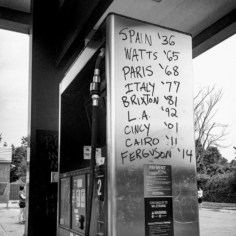 The gas pump graffito at the very least suggests that what is happening in the streets of Ferguson also occurred in the streets of Cincinnati or Brixton, but it is also somewhat didactic, requiring knowledge of the historical events that transpired in these places. Importantly, the graffito does not mention the specific racialized injustices revealed in Brown’s death but instead offers, on the side of a gas pump, a compact, global history lesson on the struggle against state violence. Universalizing state