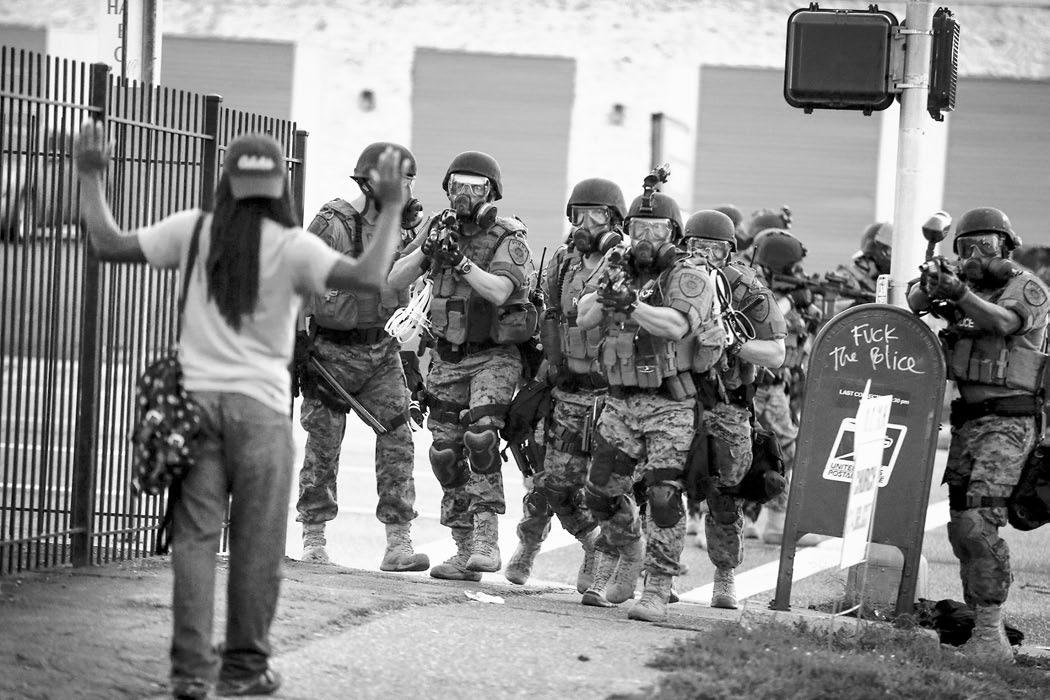 lice state. As Brown’s blood stained the asphalt, thousands of protesters in Ferguson and throughout the country symbolically embodied the young man. Standing sometimes inches from police wearing riot gear, they mirrored Brown’s alleged last position, chanting, “Hands up, don’t shoot!”