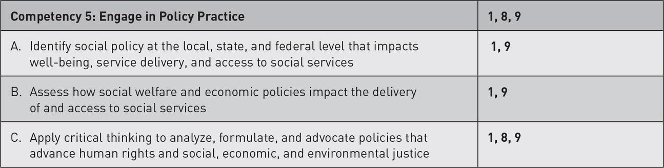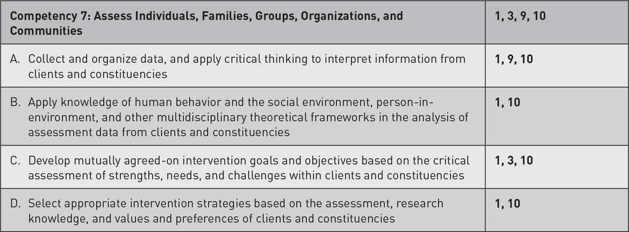 The content and resources in this book will provide you with the tools necessary to develop and demonstrate competence in the nine core competencies and component behaviors necessary for competent generalist practice. This, however, is not always a clear-cut process; so, at the beginning of the text is a chart that identifies which core competencies are address by which chapter. Also, for those IAs that relate specifically to a core competency, those core competencies will be identified. The difference between developing and demonstrating a competence in the field versus in the classroom is that in the field, you will be completing various practice tasks; thus, a list of suggested field tasks that reflect the chapter’s content is provided at the end of each chapter.