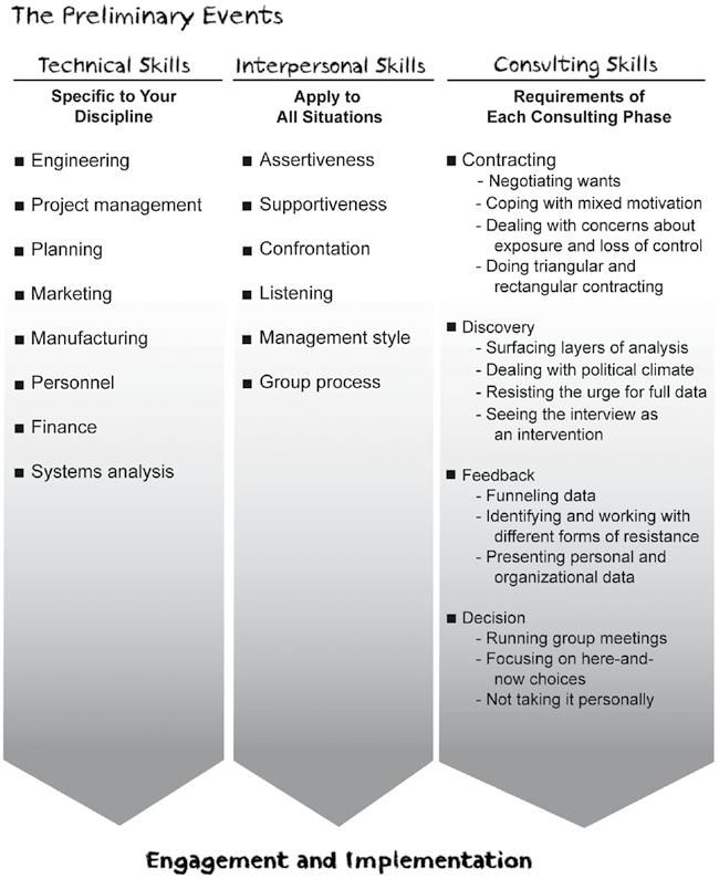 Engagement/implementation is when you finally do something with enough impact to be noticeable to many people in the organization, and they have the expectation that change, or learning, will occur because of that event.The preliminary events are, in many ways, more crucial for success than the engagement/implementation. An understanding of consulting skills therefore is really an understanding of preliminary events that are a necessary prelude to any real change.