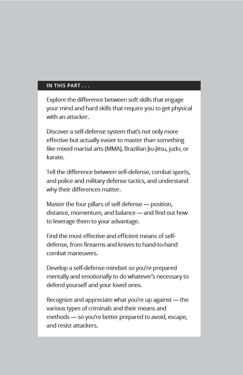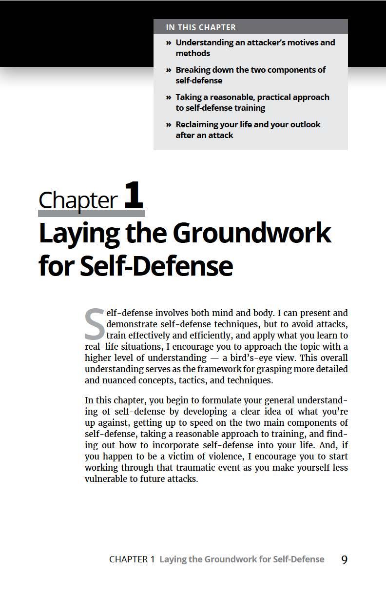 In this chapter, you begin to formulate your general understanding of self - defense by developing a cle ar idea of what you' re up against, getting up t o speed on the two main com ponents of self-defense, taking a reasonable approach to training , and finding out how to incorporate self-defense into you r life. And, if you hap pen to be a victim of viole n ce , I encourage yo u to start working through that traumatic event as yo u make yo urself less vulnerable to future attacks .