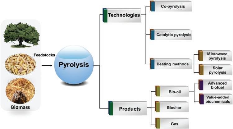 Depending on the operating conditions, the pyrolysis process can be categorized as either slow, fast, or flash pyrolysis [108]. In the slow pyrolysis process, lower temperature (550–950 K), slow heating rate, and long residence time (several hours to days) are applied to prepare BC as the primary product [109]. While in the fast pyrolysis method, moderate temperature (850–1250K), high heating rates (on the order of 100 οC/sec), and short residence time are used to prepare bio-oil with a maximum yield of ~75% [109]. The prepared crude pyrolytic bio-oil can be further upgraded and purified to advanced biofuels or biochemicals through fast pyrolysis. In contrast, flash pyrolysis is based on heat treatment at a higher temperature (1050–1300 K) for less than two seconds producing a higher yield of bio-oil than gas and BC [109]. However, bio-oil produced by flash pyrolysis is acidic, unstable, and highly viscous, and contains solids and dissolved water [110, 111]. Hence, reducing the oxygen content in the final product (bio-oil) is essential by using advanced methods, such as hydrogenation and catalytic cracking. To improve the yield and properties of biooil, BC, and gas-derived from biomass, many pyrolysis techniques, including co-pyrolysis [112], catalytic pyrolysis [113], microwave pyrolysis [114], and solar pyrolysis [115] have already been developed (Figure 1.5).