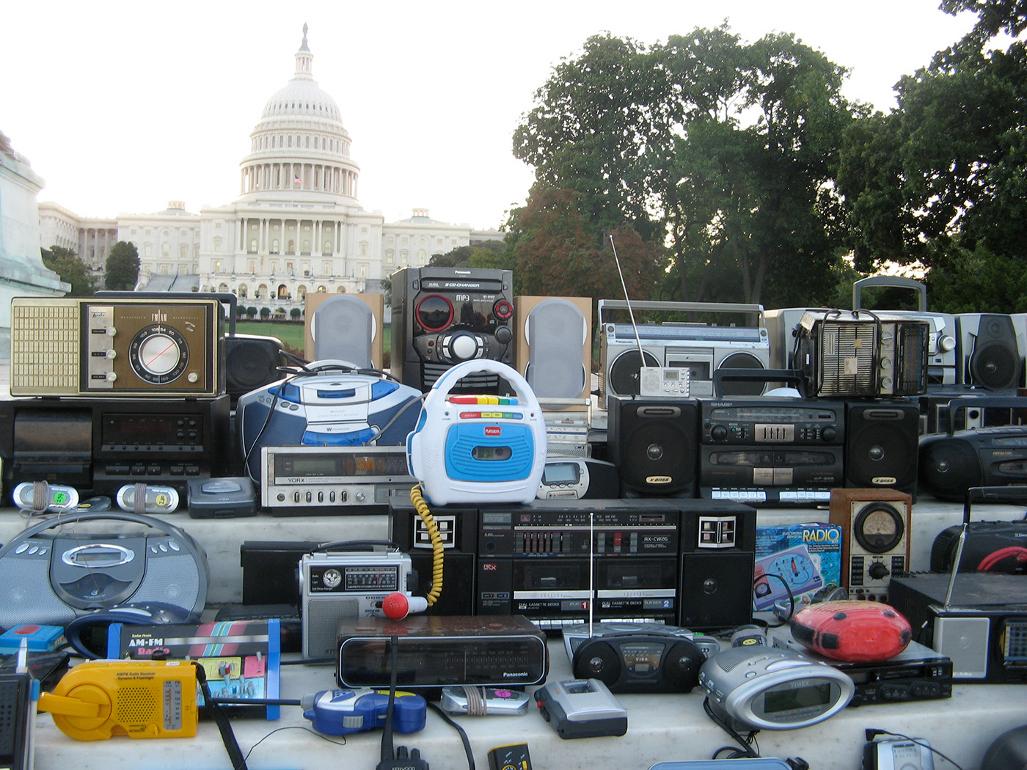 Just as soon as things got moving, a series of legal attacks were launched against the LPFM movement. Among these was the Radio Preservation Act. This legislation, introduced by the National Association of Broadcasters (NAB) and National Public Radio (NPR) and passed by Congress in 2000, used exaggerated interference concerns to tie up urban airspace and prevent the construction of Low Power stations within heavily populated areas. Prometheus pushed forward with building stations throughout communities in rural areas while simultaneously lobbying Congress to pass another bill — the Local Community Radio Act (LCRA) — that would open more frequencies for LPFM stations. The collective took many creative approaches to bringing attention to community broadcasting, including assembling a hodge-podge of portable radios in front of the U.S. Capitol (shown in Figure 1-1) — perfectly symbolizing the array of unique radio stations that would take to their airwaves after the LCRA was passed. Ultimately, the new bill took 10 years, 20 attempts, and 50 handmade hula hoops to finally make way for legal community broadcasting in the United States. In late 2010, the LCRA finally got the support needed to pass Congress and head to the president’s desk.