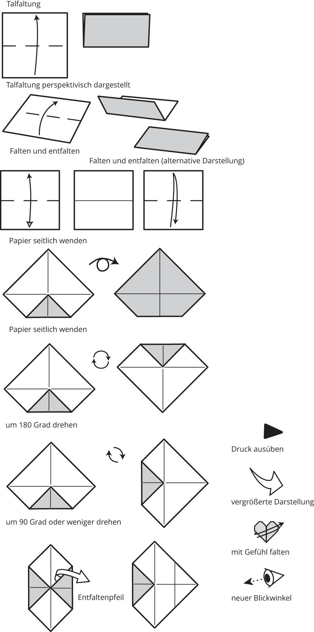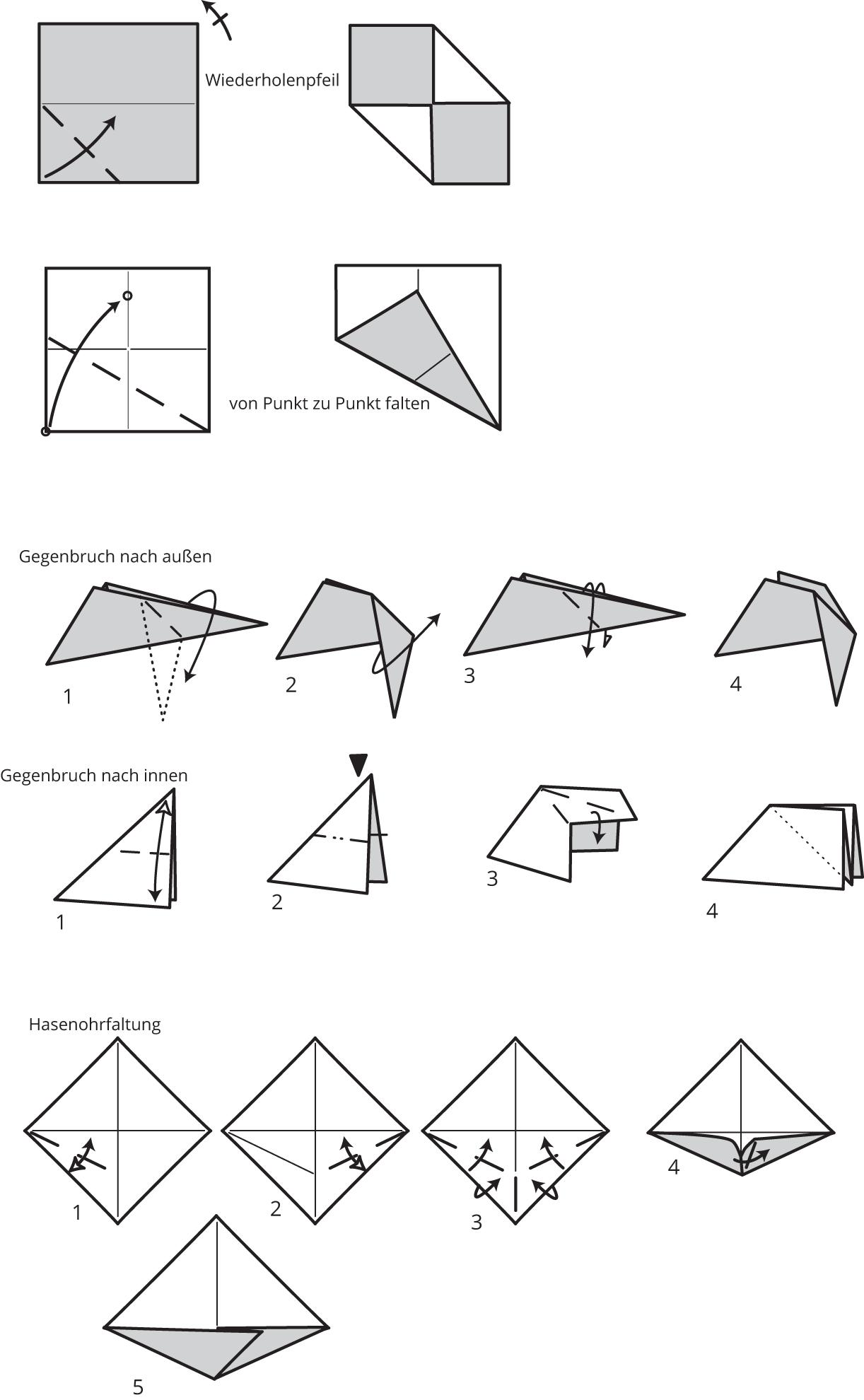 Die in Origami-Anleitungen verwendeten Symbole weichen oft leicht voneinander ab. Ich erkläre in Kapitel 1 die von mir verwendeten
