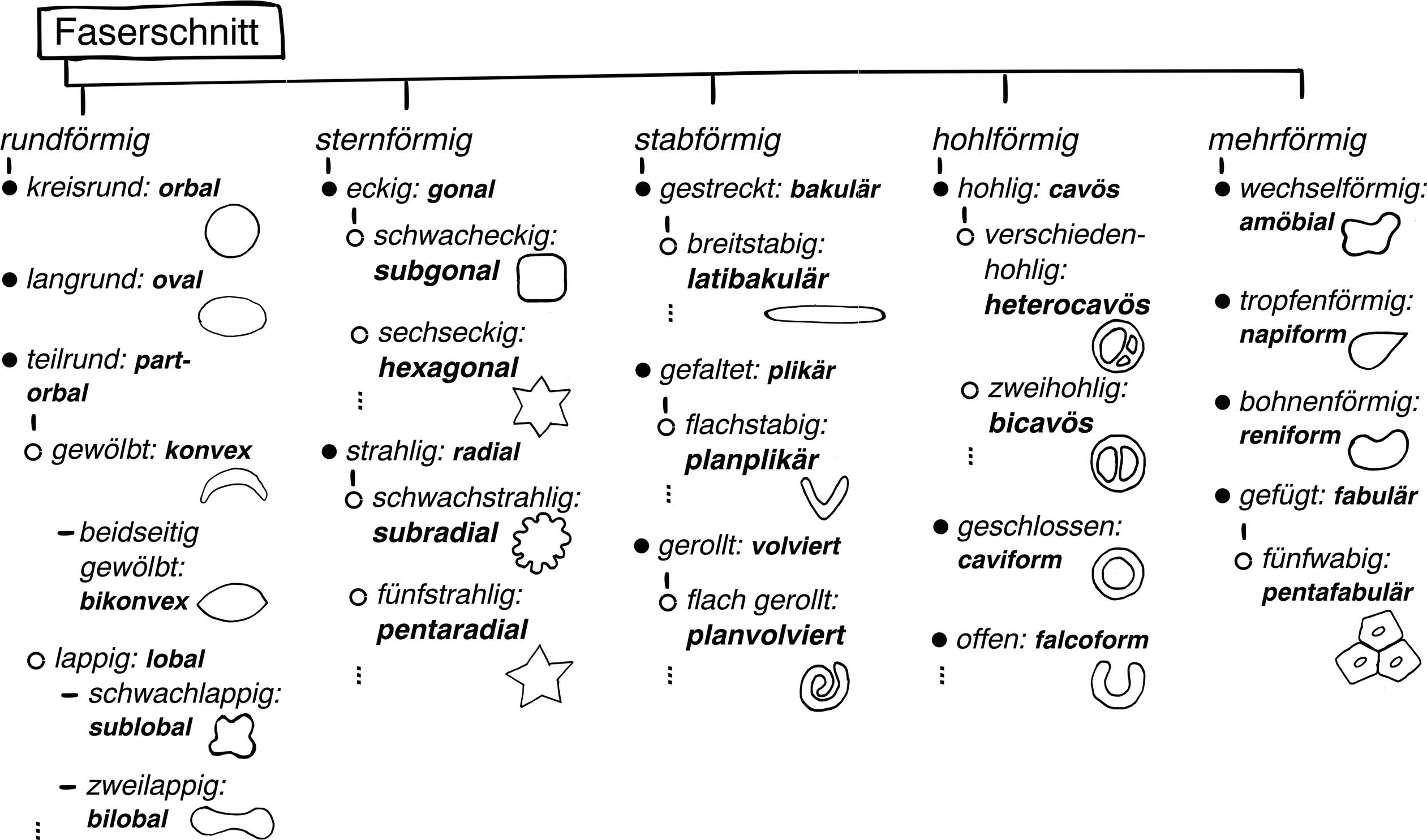 NachSchnegelsbergbeschreibtder Faserschnitt dieEigenschaft,diedieQuerschnittsgestaltderFaserbeinhaltet.BeiFasernlassensichgrobfolgendeSchnitteunterscheiden[3]: