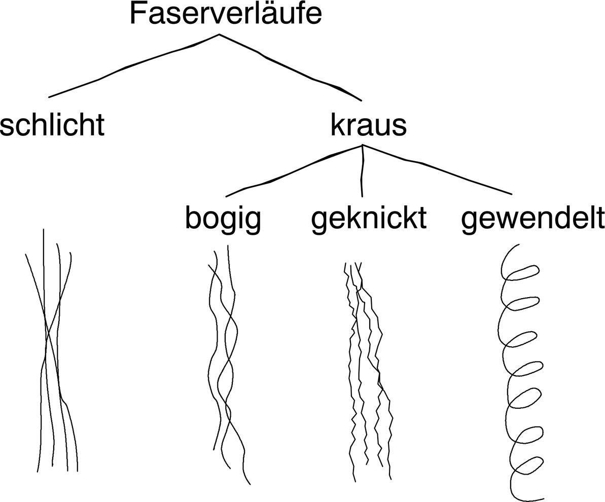 Ein Faserverlauf kanngrundsätzlich,wieinAbb.1.10gezeigt,in schlicht und kraus unterteiltwerden.ImZusammenhangmitkrausenFaserverläufenisteswichtig,zweiBegriffeklarzutrennen:KrauseundKräuselung(sieheauch[2,15]).Mit Kräuselung istein verfahrenstechnischerVorganggemeint,mitdemeineFasermitschlichtemVerlaufineinenkrausenVerlauf(Krause)überführtwird.„DieKrauseistdasErgebniseinerKräuselung“[2].