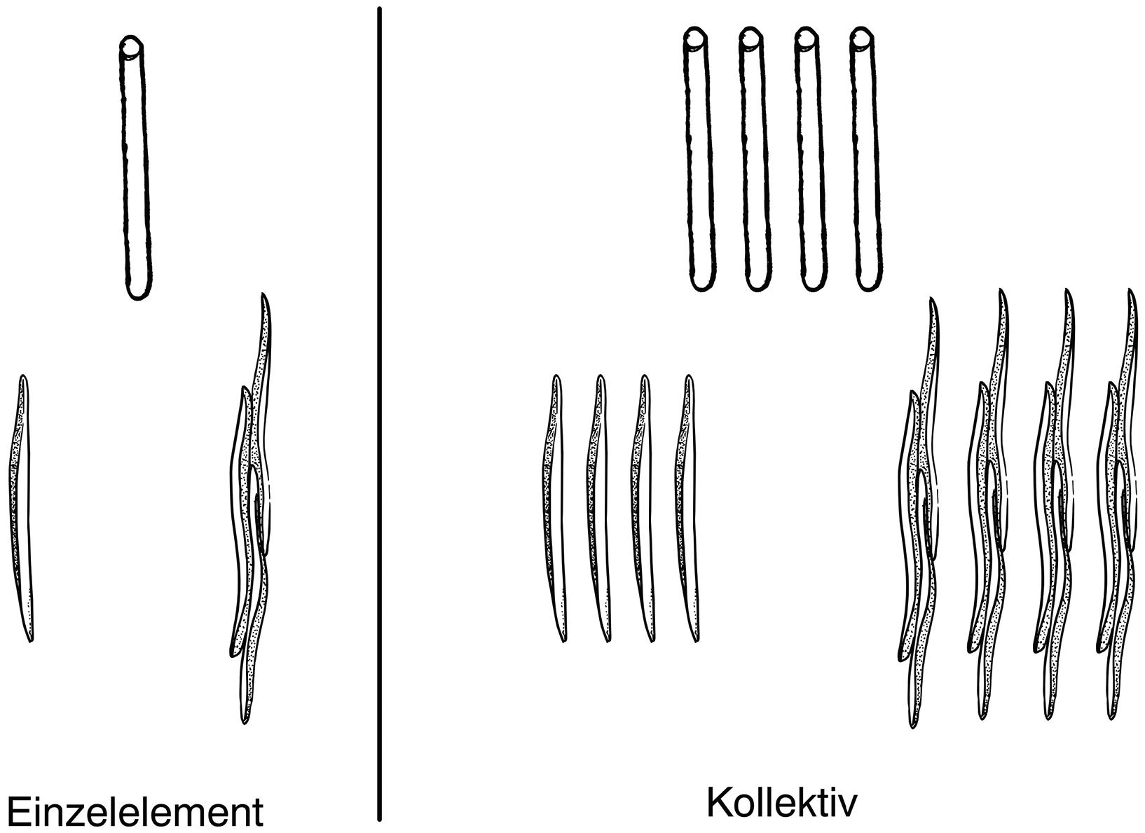 NebendemBegriffFaserkollektivmussimRahmendesBuchesauchderallgemeinereBegriff Kollektiv eingeführtwerden,danebenFasernauchandereEinzelelementewie z.B.einFaserbündelzueinemKollektivzusammengefügtwerdenkönnen.VordiesemHintergrundundunterBerücksichtigungderTatsache,dassKollektivversucheeinewichtige MethodezurCharakterisierungz.B.derLänge(Almeter),derFestigkeit(HVIundStelometer)sowiederFaser-Matrix-Haftungsind,veranschaulichtAbb.1.4verschiedeneArten vonKollektivenausEinzelelementen.
