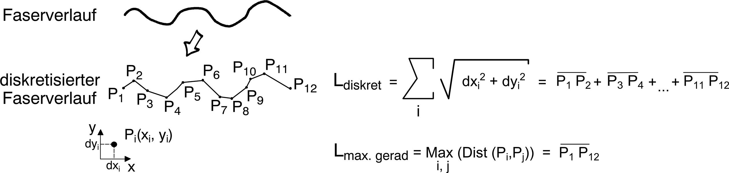ZurInterpretationvonMessdaten,diemitMethodenzur MessungderLängedergesamtenFaser ermitteltwerden,mussunbedingtdieArtderProbenpräparationunddieArtdes Messprinzipsbeachtetwerden.EsergebensicherheblicheUnterschiede,wennbeieiner gesamtenFaserdiemaximalegeradlinigeVerbindungdesFaserverlaufs(��max.gerad )oder dieMessungentlangdesFaserverlaufs(Ldiskret )gemessenwird(vgl.Abb.1.14)[15].IndiesemZusammenhangseiangemerkt,dassbeioptischenMessungendiegemesseneLänge immerauchvondergewähltenoptischenAuflösungabhängt.
