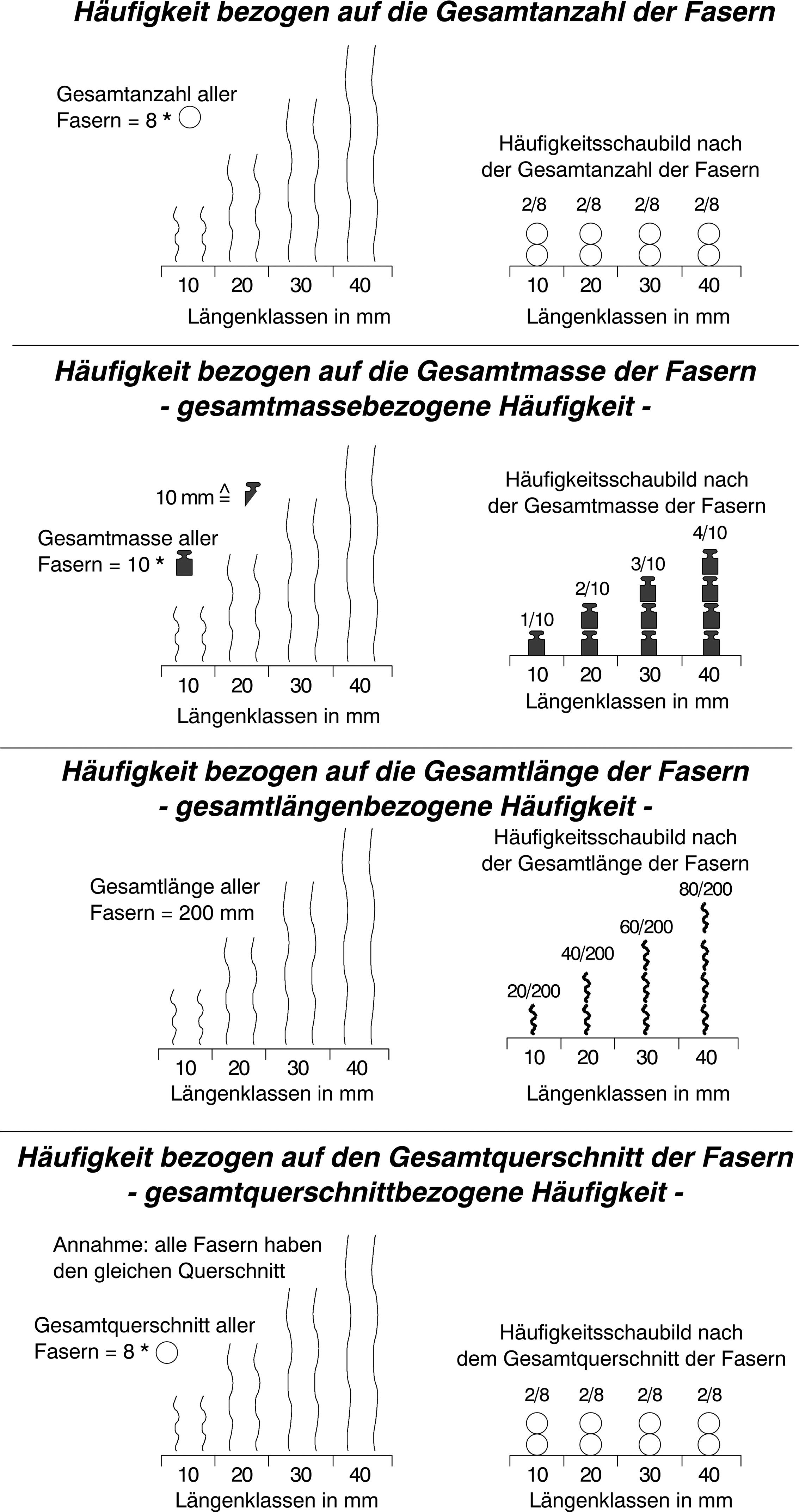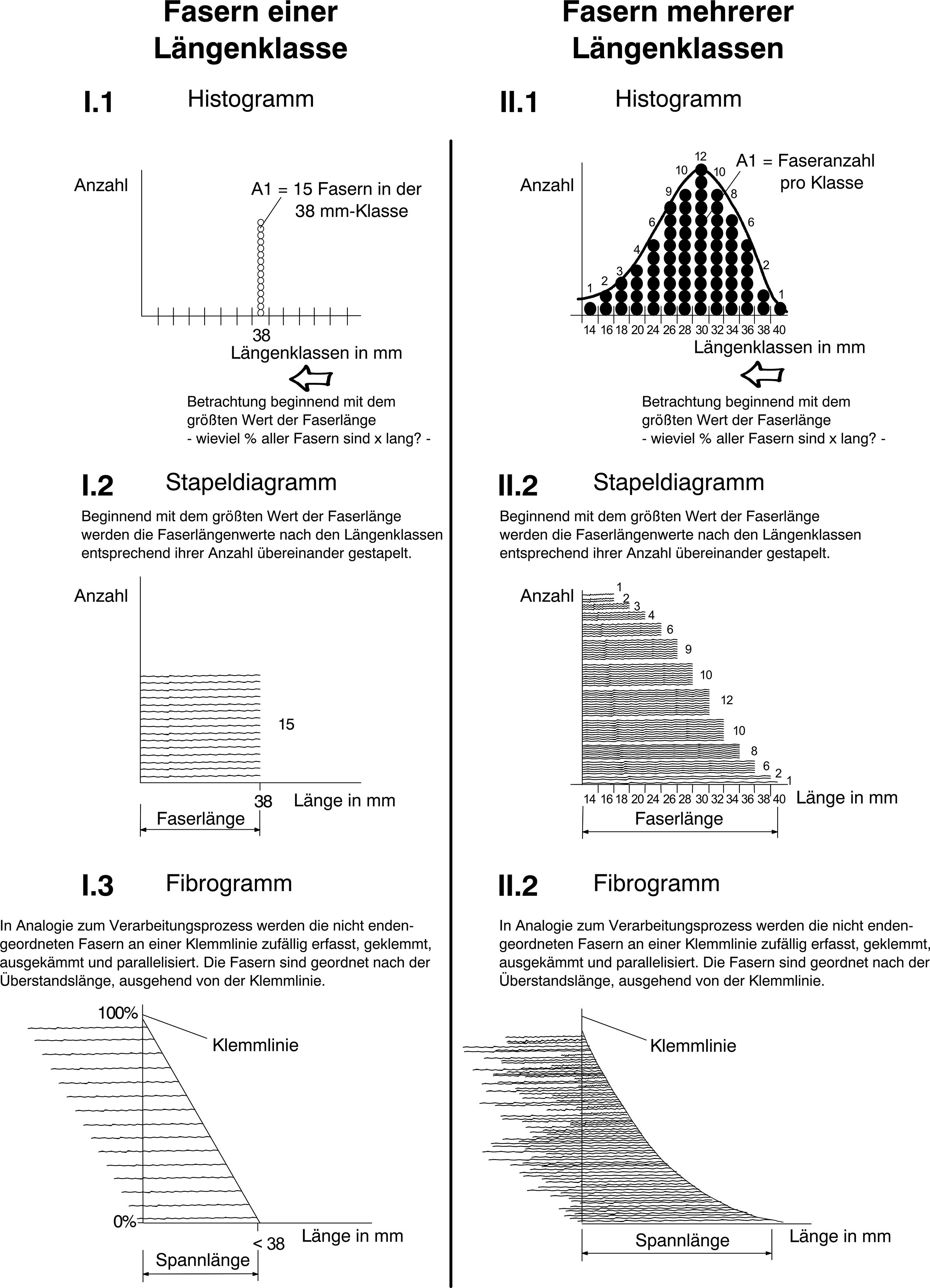 DieWerteundHäufigkeitsverteilungenausMessungenderMethoden LängedesTeilabschnittseinerFaser und LängedergesamtenFaser unterscheidensicherheblichunddie MesswertesindimmerunterNennungderMethodeanzugeben.DieAbb.1.16zeigtdenZusammenhangzwischenHistogramm,StapeldiagrammundFibrogramm.DieAnwendung