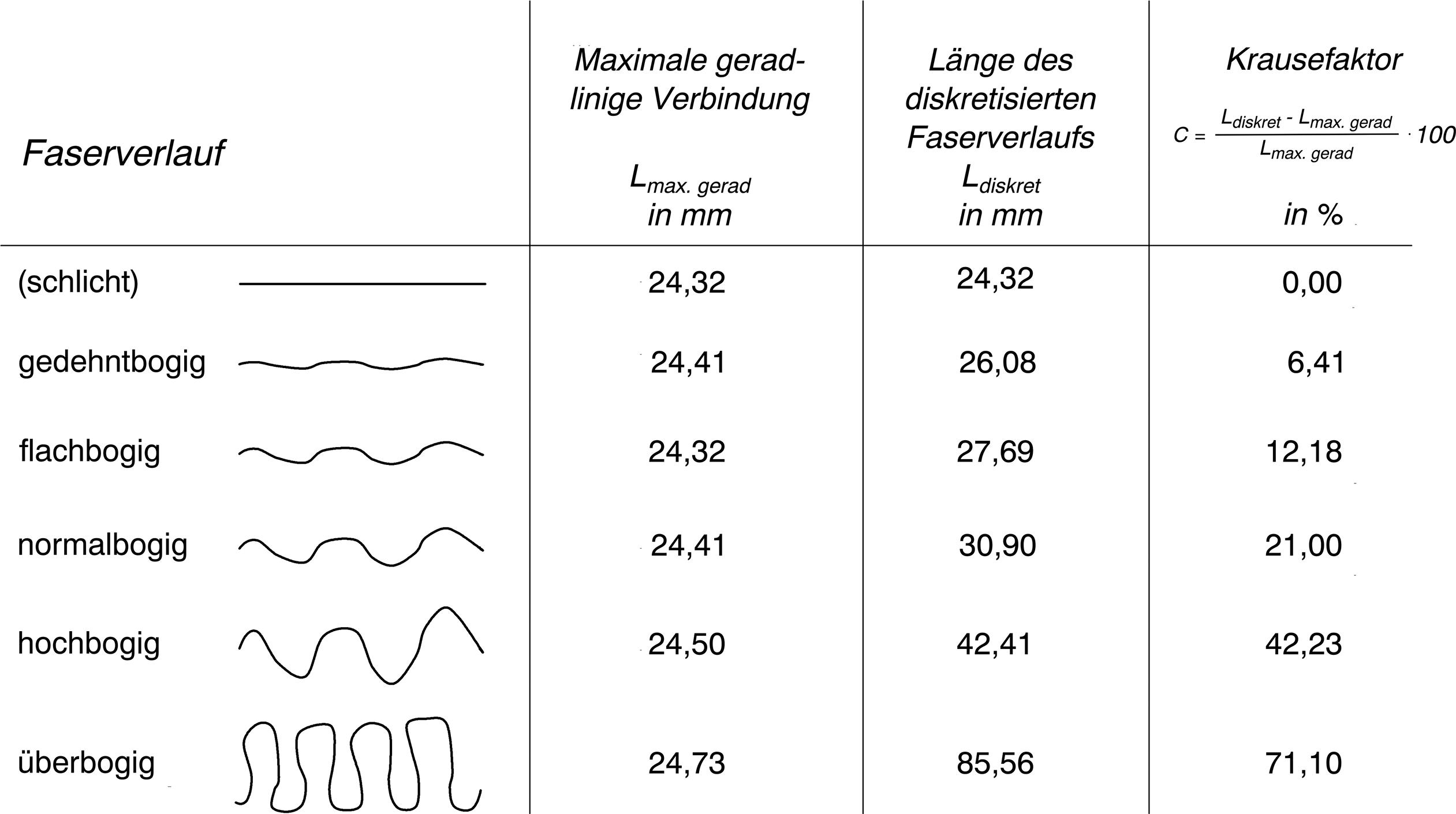 MitAbb.1.10lässtsichnebenderbegrifflichenZuordnungaucheinersterwichtiger AspektderFaserlängenmessungbeschreiben.Wiein[15]ausgeführt,habenalleFasernin Abb.1.10beireinerBetrachtungderErstreckungineineRichtungetwadengleichenLängenwert.WenndiegewendelteFaserlanggestrecktwird,ergibtsichimVergleichzurFaser mitschlichtemVerlaufeinetwadoppeltsogroßerWertderLänge.MitdiesemBeispielsoll deutlichwerden,wiewichtigdiePräparationsmethodikaufdasErgebnisderLängenmessungseinkann[15].