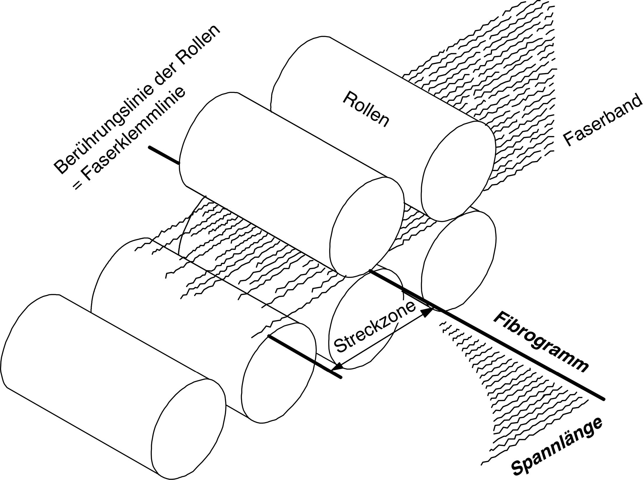 DieAbb.1.15zeigteinenAusschnitt(Walzenstreckwerk)ausdemSpinnereiprozess, wobeieinFaserbandverstrecktwird.DieAnalogiezurVermessungder LängedesTeilabschnittseinerFaser bestehtdarin,dassnichtendengeordneteFasernzufälliganeiner Klemmlinieerfasstwerden.DievonderKlemmlineindieStreckzoneorientiertenFasern werdenbezüglichihrerTeillängegemessenundinFormeinesFibrogrammsaufgetragen. ImFibrogrammwerdendieFasernnachihrerÜberstandslänge(Spannlänge)geordnet dargestellt[15].