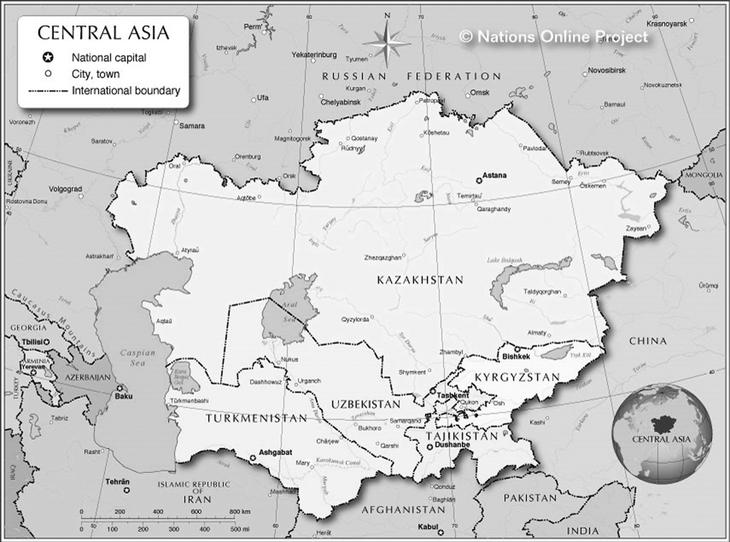 There are some issues that simply have no easy answer. I resolved them by balancing the native language names and spellings, as much as possible, with the ease of the reader. Wherever possible, I replaced Russified names of people and places (even during the Soviet era) with the current Central Asian spelling. If a Central Asian author has published in English, I used the spelling of the given publication. Acronyms reflect the native language, unless there is a commonly used acronym in English-language sources.