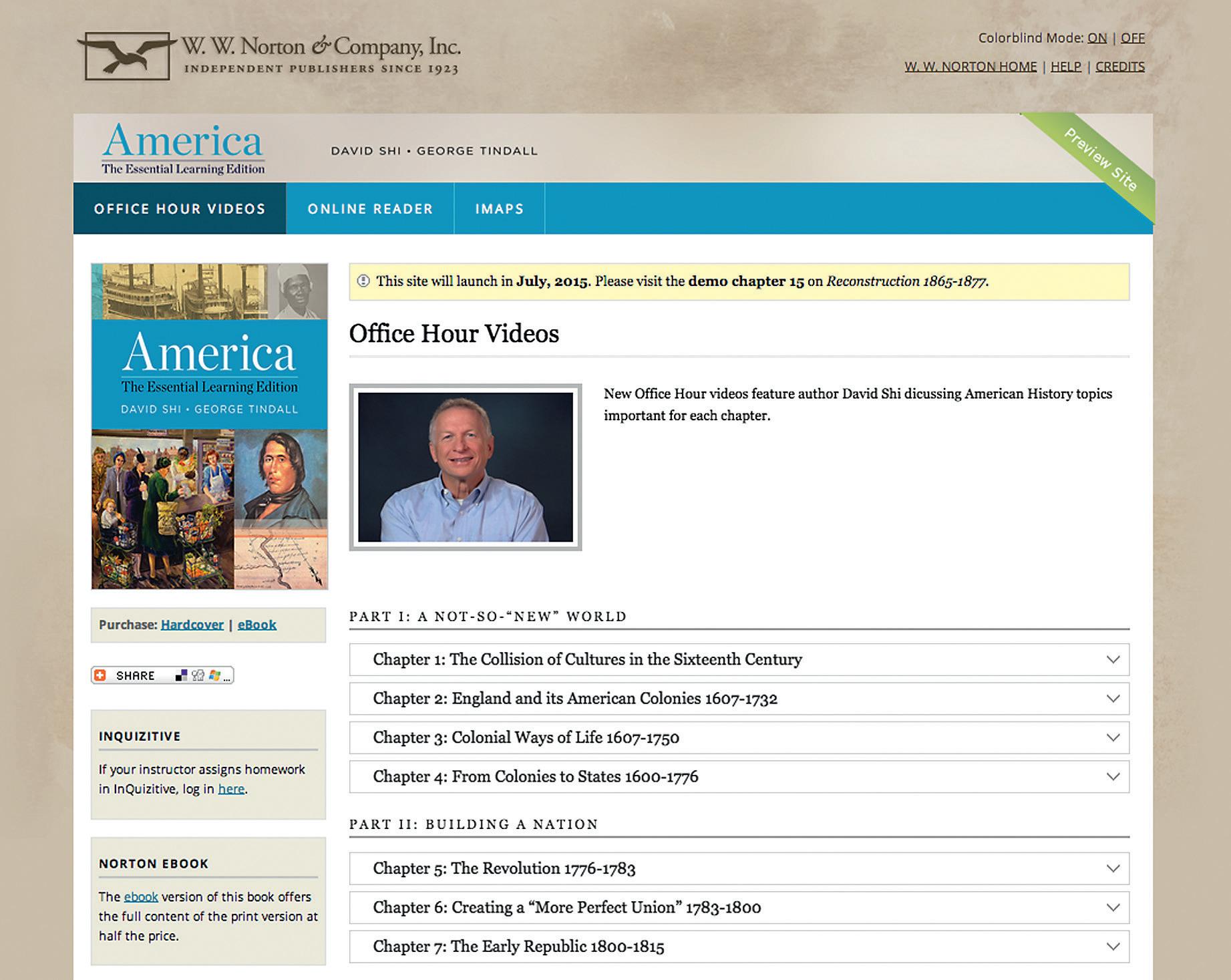 This free site offers students access to additional resources to support student learning. Features include NEW! Chapter overview videos that prepare students for the reading by highlighting key events and themes that emerge in the chapter. In addition, there is a comprehensive collection of author videos exploring the core objectives from each chapter. Interactive iMaps, as well as an online reader featuring additional primary source documents, provide students with even more opportunities to engage with primary sources.